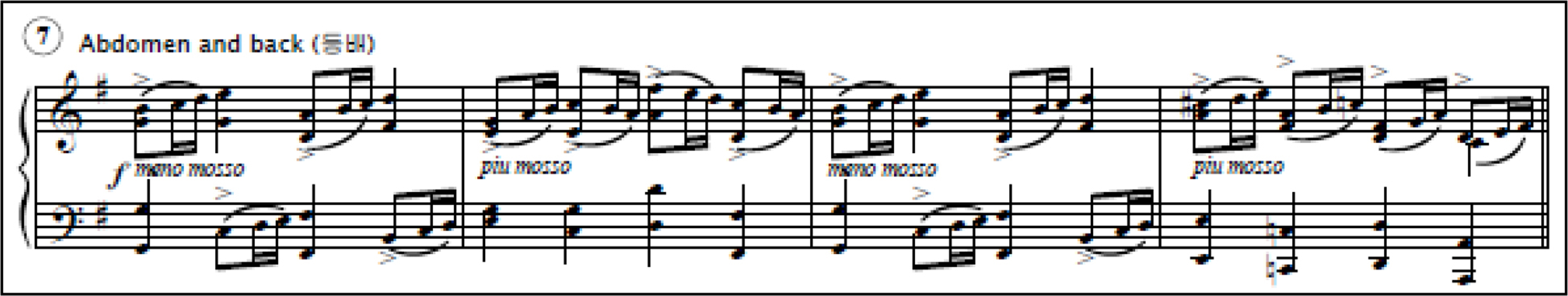 National Gymnastics borrowed the concept of using music as both a conductor and a mnemonic aid from Radio Exercise. The primary function of the music is to provide rhythmic cues and tempos that synchronize with the body movements. Additionally, the music subtly adjusts its tempo and mood to correspond to the flow and nature of the movements. For example, the music is soothing and peaceful in accordance with warm-up and light body movements during the beginning of the gymnastics programs. As the movements become intense, the music also becomes intense and reaches a climax. For the jumping exercise, the music changes to a cheerful tune. It finally returns to a relaxing and peaceful mood for the breathing exercise and warming down. The contrast between fast and slow tempos is especially striking in the seventh body movement, abdomen, and back exercise. In Music Example 5, the first and third measures are for abdomen exercise and the second and fourth are for back exercise. The abdomen exercise is a quick movement which is to stoop down and then straighten, while the back movement is a slow movement, which is to stretch oneself. The tempo of the music changes to give the performer enough time for the movements.