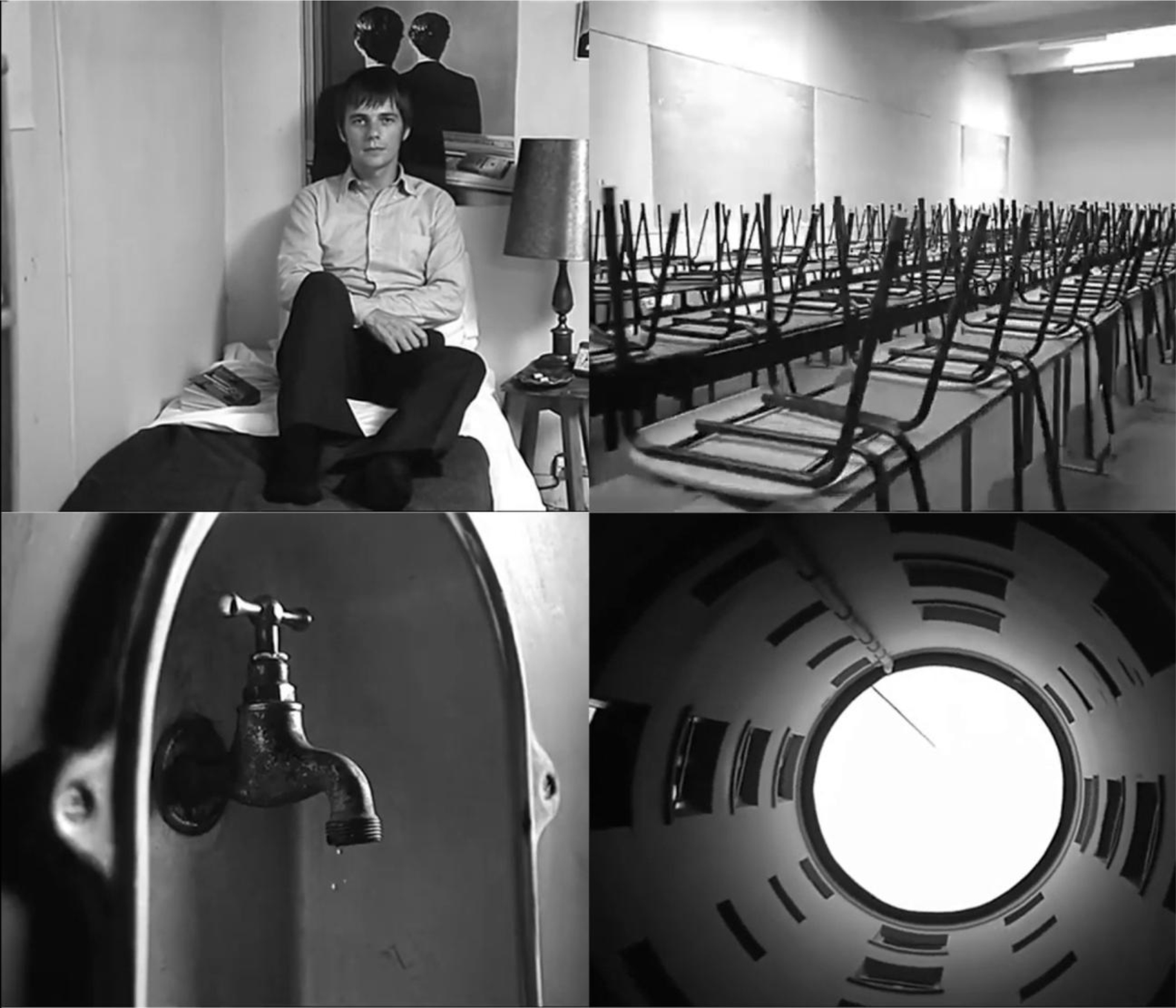 In the film adaptation of the novella from 1974, directed by Bernard Queysanne and Perec himself, the sound sphere of the infra-ordinary likewise assumes a prominent role (Figure 1).42 During the first ca. fifteen minutes, up to the point when the student (played by Jacques Spiesser) refrains from pursuing his studies, the ticking of the clocks is almost continuously present on the musique concrète-inspired soundtrack by Phillipe Drogoz and Eugénie Kuffler. On a visual level, the sounds of alienation are complemented by images of sameness and circularity, such as when the camera pans along a line of identical chairs in the classroom.With each passing day your patience has worn thinner, the hypocrisy of your pitiful efforts has been laid bare. Time would have had to stand still, but no-one has the strength to fight against time. You may have cheated, snitching a few crumbs, a few seconds: but the bells of Saint-Roch, the changing traffic lights at the intersection between Rue des Pyramides and Rue Saint-Honoré, the predictable drip from the tap on the landing, never ceased to signal the hours, the minutes, the days and the seasons. You may have pretended to forget time, you may have spent nights walking and days sleeping. But you couldn’t ever quite get away with it.41