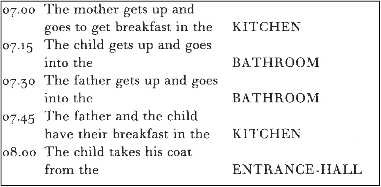 Perec humorously illustrates the division of living space along the timely patterns of everyday activities in the form of a bureaucratically detailed schema (Figure 2).It seems to me … that in the ideal dividing-up of today’s apartments functionality functions in accordance with a procedure that is unequivocal, sequential and nycthemeral. The activities of the day correspond to slices of time, and to each slice of time there corresponds one room of the apartment.44
