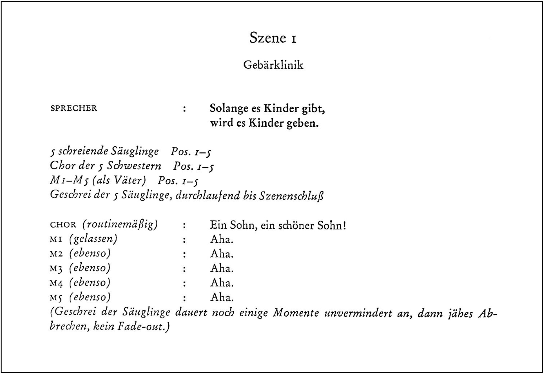 Mediated through the work of the nouveaux romanciers, the theme of the everyday furthermore found its way into experimental radio art. This influence becomes evident when comparing Michel Butor’s Fluglinien (Airways) with the inaugural piece of the New radio play, Ernst Jandl and Friederike Mayröcker’s Fünf Mann Menschen (Five men humans).53 As Würffel has pointed out, Butor’s play, which consists of bits and pieces of everyday conversations between anonymous passengers on a flight, abounds with formulaic patterns of speech while gradually undermining the individual voice to the point of being indistinguishable.54 In the same manner, the title Fünf Mann Menschen, in referring to an anonymous group of people, is suggestive of the loss of individuality in modern society. The play presents a range of speech scenes, depicting a thoroughly standardized, bureaucratically “administered” life cycle, leading from birth to school and job counseling to the military and eventually death. Instead of individualized characters, it features as main roles a speaker and five male voices, passing through the stages from childhood to adulthood. As the authors note, their voices should sound “jeweils differenziert, doch nicht charakterisiert” (distinguishable, yet not characterized).55 The birth clinic scene (Figure 3) opens and closes the piece circularly, thus evoking an endless loop of repetitive social acts, hierarchies, and behavior. The nurses’ chorus comments “routinemäßig” (as a matter of routine) on the event of birth, “Ein Sohn, ein schöner Sohn!”) (A son! A beautiful son!), followed by the laconic “aha” of the fathers, sounding five times in succession while moving from the left to the right position of the stereo field.