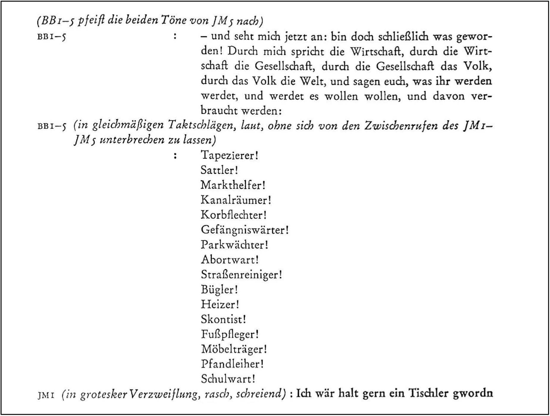 Throughout the piece, stereophonic multiplication of voices, word repetitions, and the deadpan, matter-of-fact style intonation serve to evoke sameness, social uniformity, and routinization. In scene no. 5, entitled “Berufsberatung” (job counseling), the speech delivered by the “Berufsberater” (job counselor) is recorded five times, “möglichst gleichartig und im gleichen Tempo” (as similarly as possible and in the same tempo), and the takes then sound simultaneously from the five stereo positions.57 The dialogue between the counselor (BB) and the young men (JM) unfolds as an ironic commentary on the negation of freedom of choice in terms of self-realization (Figure 4). The counselor, who characterizes himself as a mouthpiece of the economy, tells the youngsters that their role in society will be chosen for them. Subsequently, he starts to list a number of professions, spoken “in gleichmäßigen Taktschlägen” (in a steady beat), while ignoring the desperate objections on part of the boys.