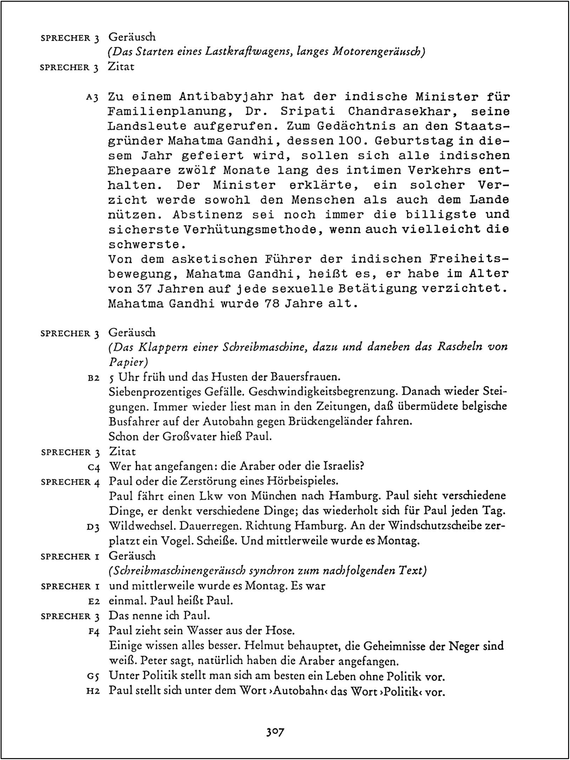 In his analysis of the play, Hans-Edwin Friedrich rightly points out that the quotations serve to render audible the antithesis between society and the individual.60 As the interspersed speeches stand out from their immediate context, the sphere of politics appears removed from Paul’s everyday. Though he is constantly exposed to news coverage, he is not able to form a critical consciousness of his own. His understanding of politics narrows down to what concerns his life as a truck driver. As the voice H2 (see Figure 5) ironically remarks: “Paul stellt sich unter dem Wort ‘Autobahn’ das Wort ‘Politik’ vor” (When Paul thinks of the word “autobahn,” he thinks of the word “politics”). On the other hand, the extensive use of media content—newsflashes, sports reports, advertisements, and television sounds—exposes the media’s role in infiltrating and disintegrating the everyday. The individual seems but a passive container to be filled with haphazard content.