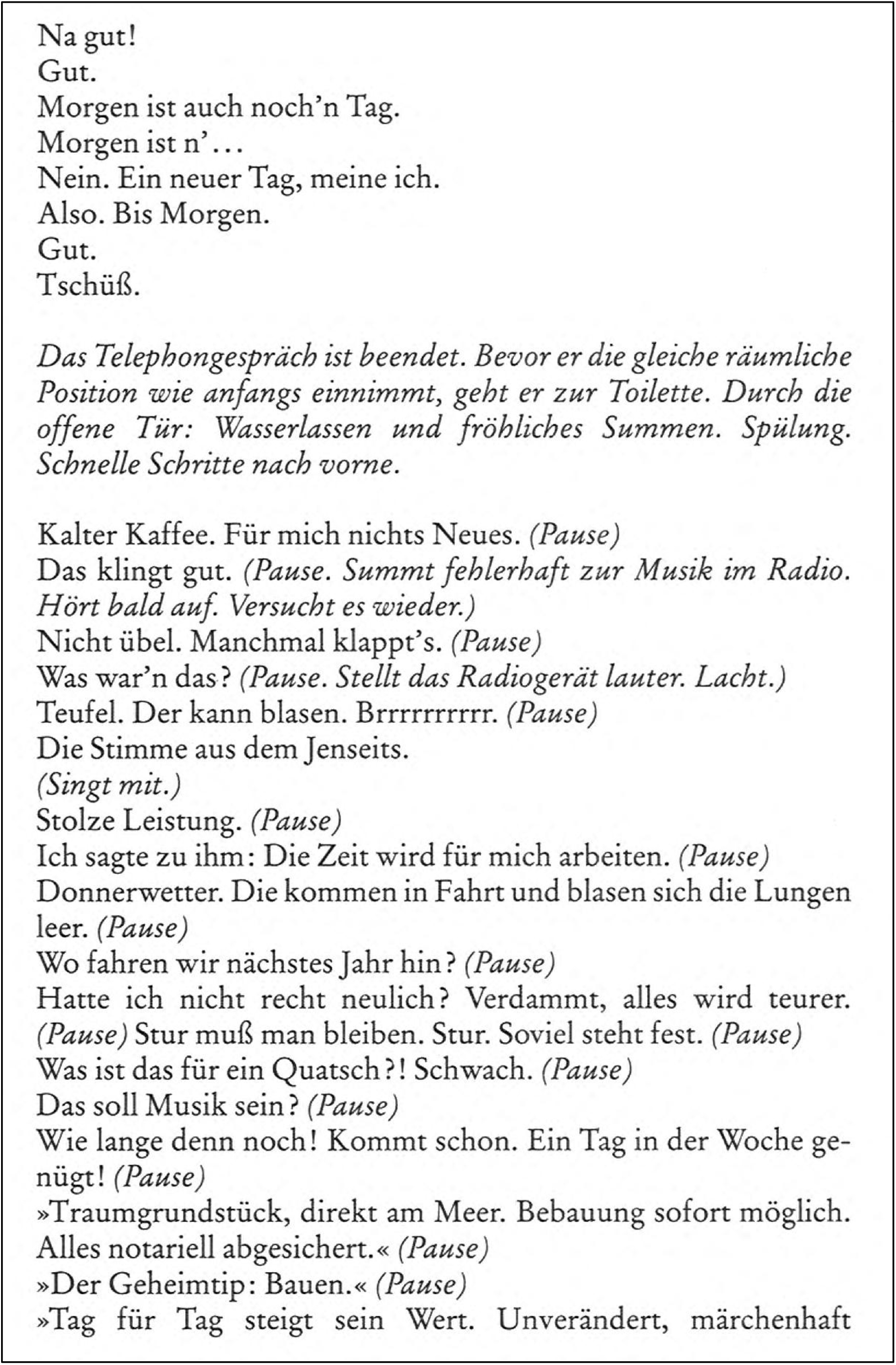 The entire text consists of a sequence of unrelated, deliberately trivial as well as partly nonsensical statements and utterances, which make up Paul’s petty inner and outer reality. As voice D3 laconically remarks, “Wildwechsel. Dauerregen. Richtung Hamburg. An der Windschutzscheibe zerplatzt ein Vogel. Scheiße. Und mittlerweile wurde es Montag” (Deer crossing. Continuous rainfall. Direction Hamburg. A bird bursts on the windshield. Shit. And meanwhile it became Monday). The string of impressions evokes the ceaseless and monotonous passage of days. In the course of the play, certain phrases are repeated, varied as well as broken up into fragments. This technique establishes a web of motivic connections, while simultaneously enhancing the sense of empty repetitiveness that lies at the heart of Paul’s existence.