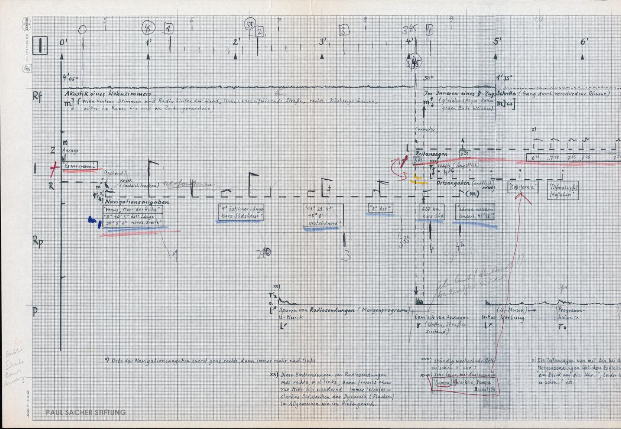Schnebel’s engagement with radio marks an extension of his interest in exploring listening as a compositional subject. In the 1960s, he created a piece called Ki-No, Nachtmusik für Projektoren und Hörer, for speaker, percussion, tape, and 2–4 slide projectors (Ki-No, night music for projectors and listeners). During the performance, the audience is stimulated to form sounds in their mind based on various verbal and visual stimuli as, for example, notational charts. As background accompaniment, Schnebel integrates a tape recording of environmental sounds. Hörfunk juxtaposes environmental sounds with broadcasting fragments from the second programme of the Hessian radio channel (hr2).68 It comprises five individual radio pieces, which are framed by an introduction and a postlude, and interspersed with four short interludes, composed of time and interval signals only.69 Schnebel, being a newcomer to radio technology at the time, created the collage with the help of a sound engineer, to whom he gave precise instructions regarding the stereophonic arrangement of sounds, their mixing, as well as other effects to be added. In the montage plan that was used to produce the collage at the facilities of the Hessian radio channel, Schnebel groups his material into four categories: (I) “Rf” (reflections) include sounds from the domestic sphere, the city of Frankfurt, exotic places, war, nature, and the human body, (II) “I” (indications of time and place) pertain to time checks and announcements of cities and places,70 (III) “Rp” (reproductions) are documentary radio recordings of historical events, such as the moon landing, political speeches, and news coverage, and (IV) “P” (productions) comprise snippets from various hr2 radio broadcasts, organized along the daily broadcasting schedule.
