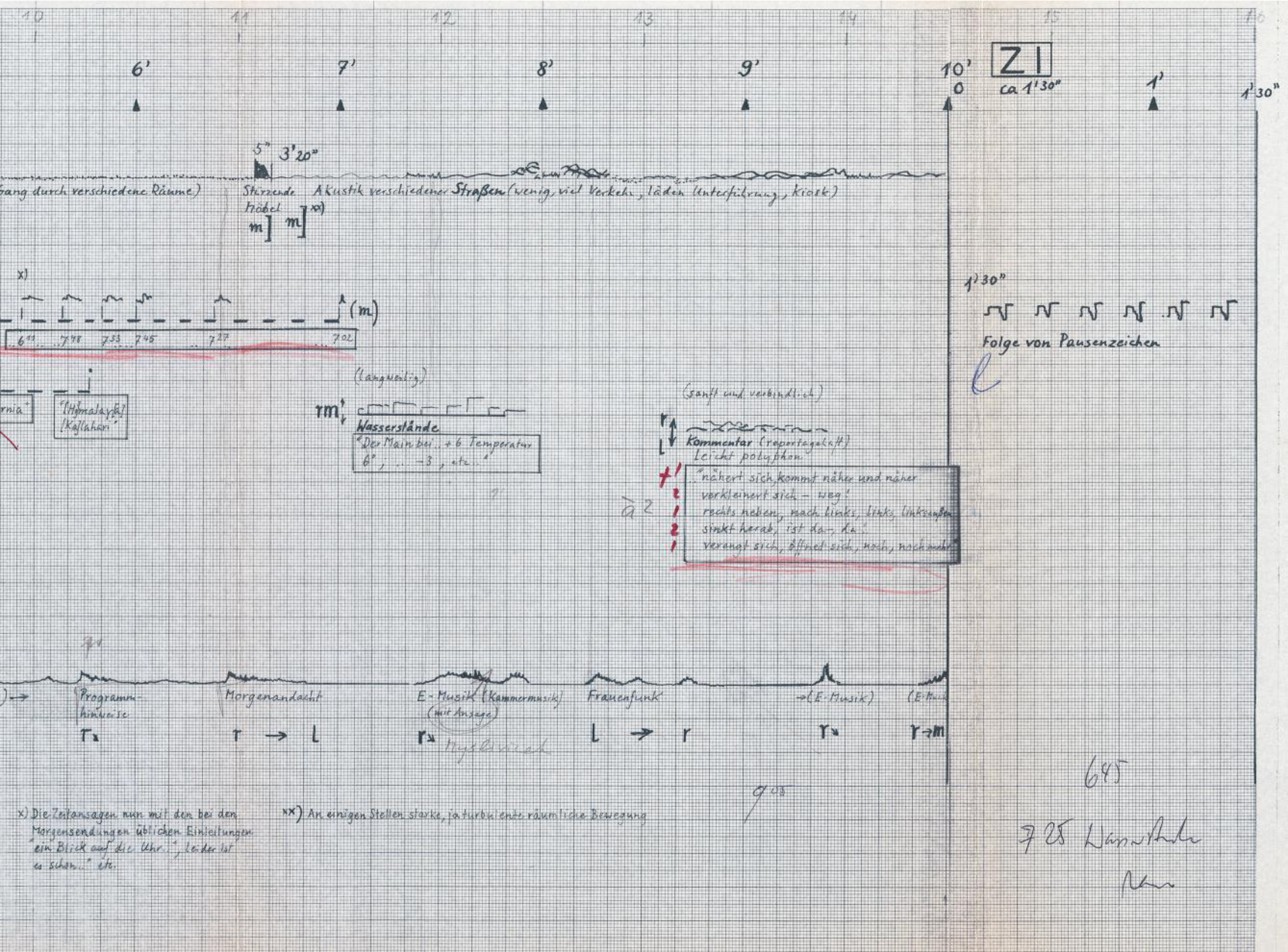 At the same time, however, Schnebel acknowledged that listening practices had become pluralized and that concentrated hearing only marked a rare occasion within a broader spectrum of auditory modes. Among these, he included listening half-attentively to the radio, while simultaneously registering sounds from one’s surroundings as well as a vague, omnidirectional mode of listening, for example, when walking through the city, that can possibly conjure up and mix with involuntary acoustic reminiscences.76 With the technical means at hand, i.e., through manipulation of volume and stereophonic movement, Schnebel sought to simulate such different types of listening behavior.One is sitting over one’s work and sounds come through the wall—underneath, the monotonous beat of a piece of U-Musik (entertainment music) is stamping, whose higher frequencies have been filtered out by the ceiling. Or the obtrusive presence of a news speaker’s voice attacks from the right, breaks through the wall while shedding off comprehensibility.75