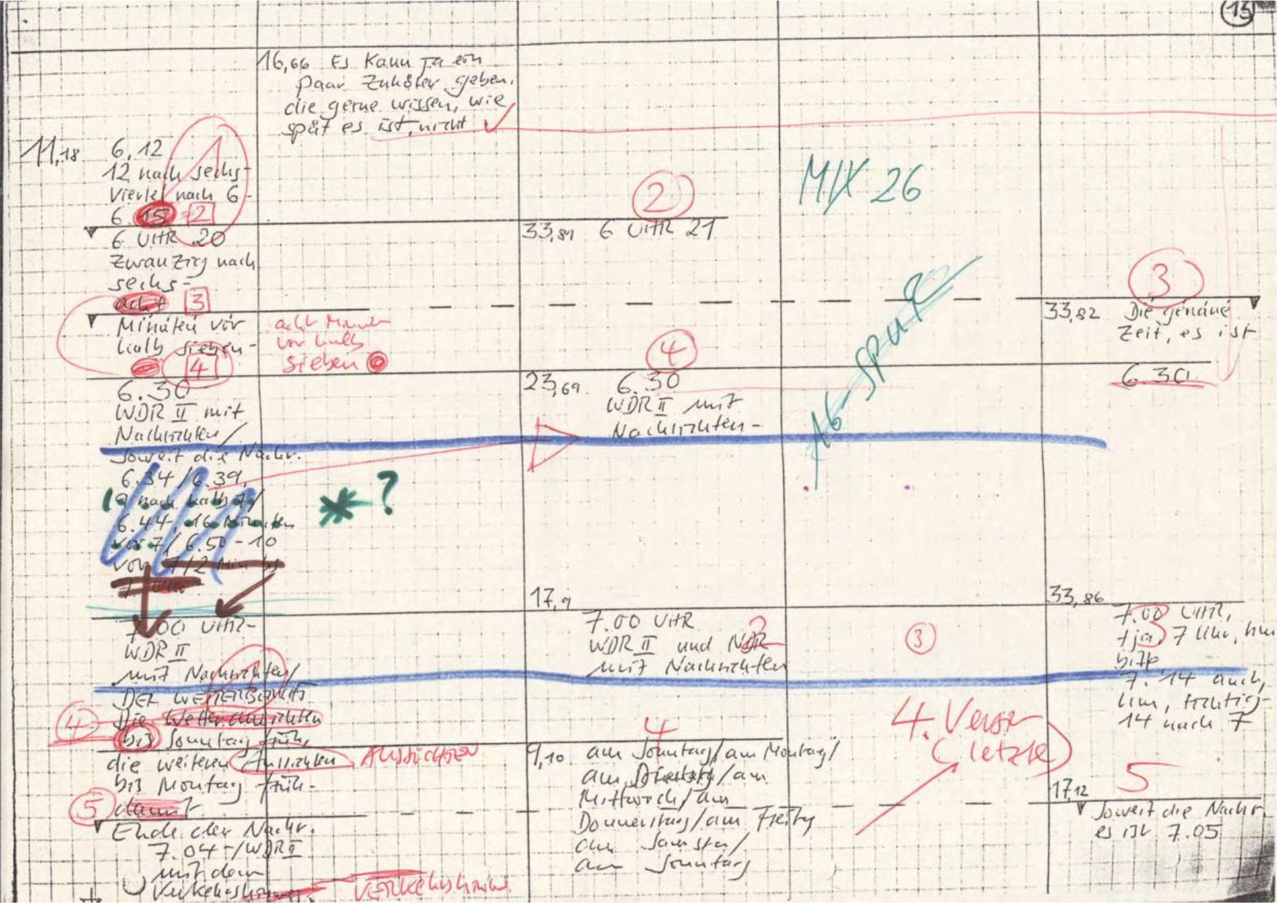 Gradually then, the collage builds in complexity, as further bits and pieces from broadcasts, such as navigational data (see indications, “Navigationsangaben”) are added. In a sudden manner, cheery music from the morning program of hr2 bursts forth (see productions, “Spuren von Radiosendungen”). By manipulating the sound volume and letting the music rotate in the stereo field, Schnebel evokes a fluid, unsteady mode of listening. As the music fades the living room scenario moves to the foreground again. After a cut follows a speedy montage of various fragments from weather and traffic reports. Then we hear a train in motion (see reflections, “Im Inneren eines D-Zugs / gleichmäßiges Rattern”). Snippets from morning broadcasts circulate. A female voice announces various exotic places. The listening space changes again to a domestic scene, with clattering footsteps busily walking around the room. A radio host comments: “So meine Lieben, der Alltag hat uns wieder” (So, my dear ones, the everyday has caught up with us again.). To this, another male radio speaker adds time announcements, arranged in a non-chronological manner: