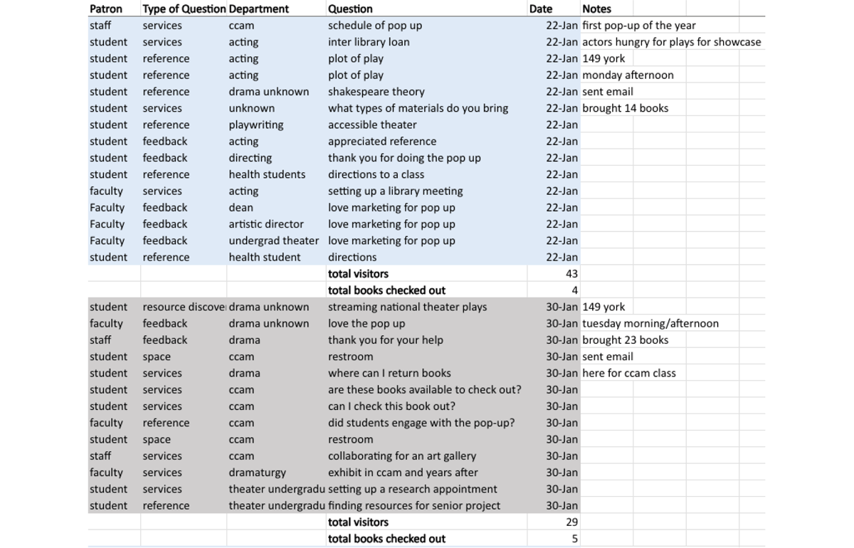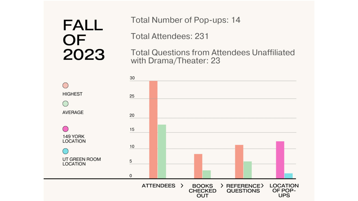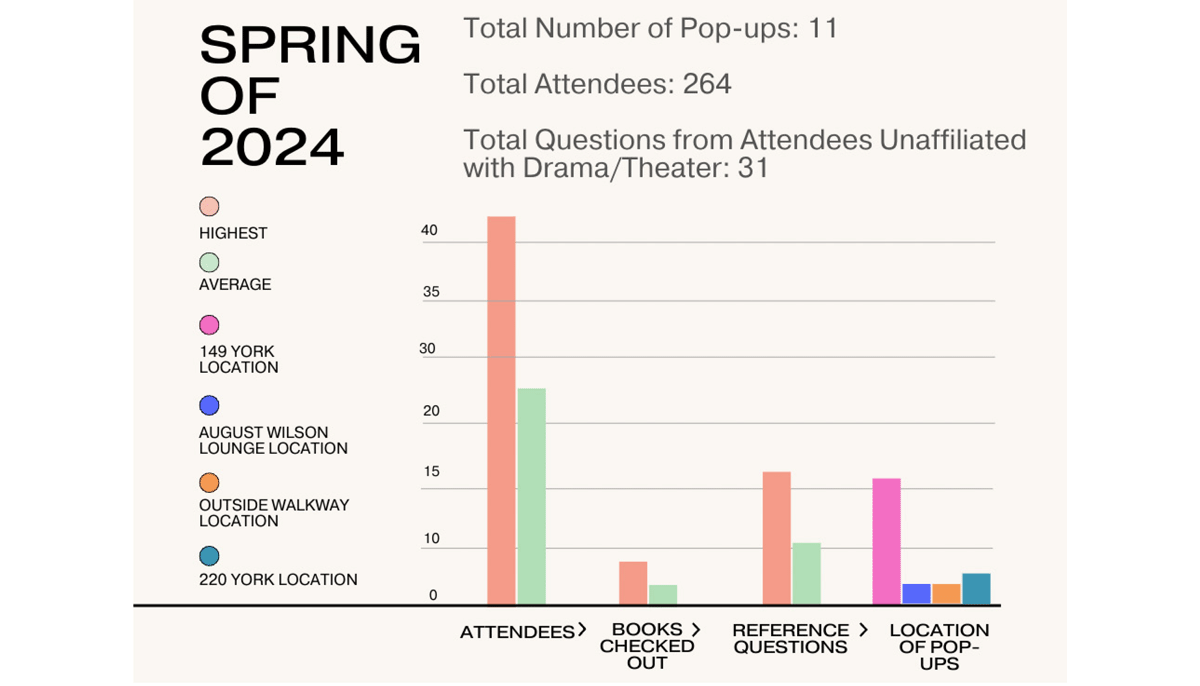 Echoing insights from O’Toole, Barham, and Monahan’s observations in the Biological Sciences Department at their institution, the pop-ups drew curious individuals from various disciplines and backgrounds, fostering spontaneous encounters and enriching dialogues.24 As a newcomer to both Yale and New Haven, the pop-ups provided an avenue for me to connect with the broader university community, engaging with students across interdisciplinary classes at CCAM, as well as encountering local New Haven residents previously unaware of our library’s open access to the public. Throughout the Fall and Spring semesters I witnessed a notable uptick in general reference inquiries from non-theatre students, faculty, and community members at the pop-ups. These interactions sparked conversations that expanded visitors’ perspectives on the interconnectedness of different artistic mediums, deepening their appreciation for the diverse resources available within my discipline.
