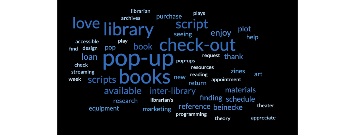 Anecdotally, many circulation staff reported seeing very few theatre students in the library in comparison to the other departments that the Arts Library serves. From my own experience in receiving formal theatrical training at various institutions, considering the demanding schedules of both students and faculty is important. Anton writes about the all-consuming scheduling of theatre-making, often prohibiting students from even attending social or community events outside the discipline.11 In their research they cite a theatre conservatory student who mentioned that the way their days are scheduled ‘makes it extremely difficult, if not impossible to spend time away from the theatre. It can be a grueling, if not all-encompassing routine.’12 Yale’s graduate students are in class each weekday until 1pm, followed with rehearsals, performances, production meetings, or actively constructing, managing, running, or producing shows sometimes until 11pm. Weekends are often devoted to eight hours or more a day spent in the theater. When one considers the need for sleep, homework, and meals, it is easy to understand why students might perceive that they do not have extra time to visit the library.