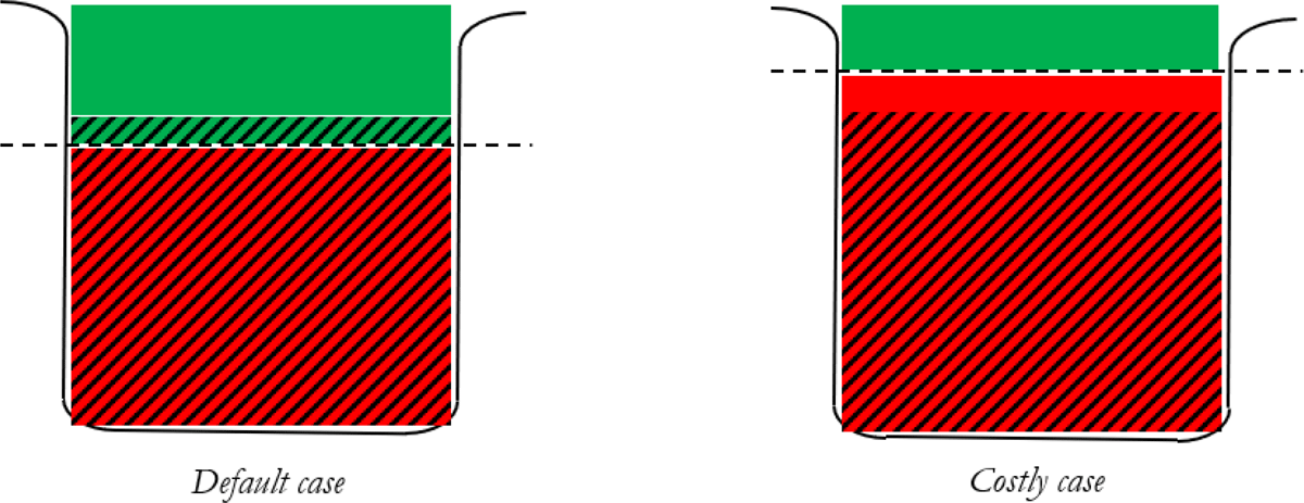 The diagonal black shading represents the extent to which one’s evidence probabilifies p (filling to the top of the cup would represent its giving p probability 1). The dotted line is the threshold for epistemically justified belief. Below it, the background is colored red to indicate that any amount of evidence below this threshold would not suffice for epistemically justified belief; above it, it is colored green to indicate that any amount of evidence above this threshold suffices for epistemically justified belief. According to the pragmatic encroachment view, the threshold rises in the costly case compared with the default case. This means that although one’s evidence probabilifies p to the same extent, in the costly case one is no longer justified in believing p.