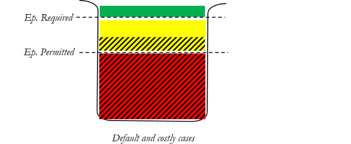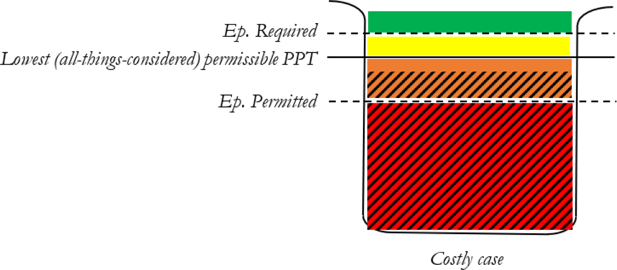 Here, we have a zone of epistemic permission, shaded yellow, between the threshold for permitted belief and that for required belief. Pretty strong but far from infallible evidence—as in the case depicted here—will exceed the former threshold but not the latter. The epistemic status of belief in p does not change between the default and costly case: in both cases it is epistemically permitted but not required, and in both cases the thresholds for both epistemically permitted and epistemically required belief remain the same. So there is no pragmatic encroachment on epistemic justification.