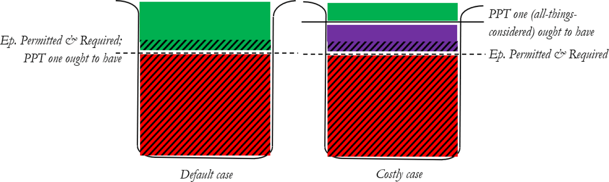 We can model all this a bit more precisely. As we saw in §2, on the most popular version of pragmatic encroachment, at least some actual or potential practical costs of believing p make it the case that one requires more evidence for epistemically justified belief in p than one would otherwise require, were those costs not present. Suppose that one has strong but far from infallible evidence for p. Let the “default case” be the one in which there are no special practical costs of believing p, and the “costly case” the one in which there are (actual or potential) costs (of the kind the pragmatic encroacher thinks makes a difference). Simplifying somewhat,28 we can represent the pragmatic encroachment view pictorially as follows: