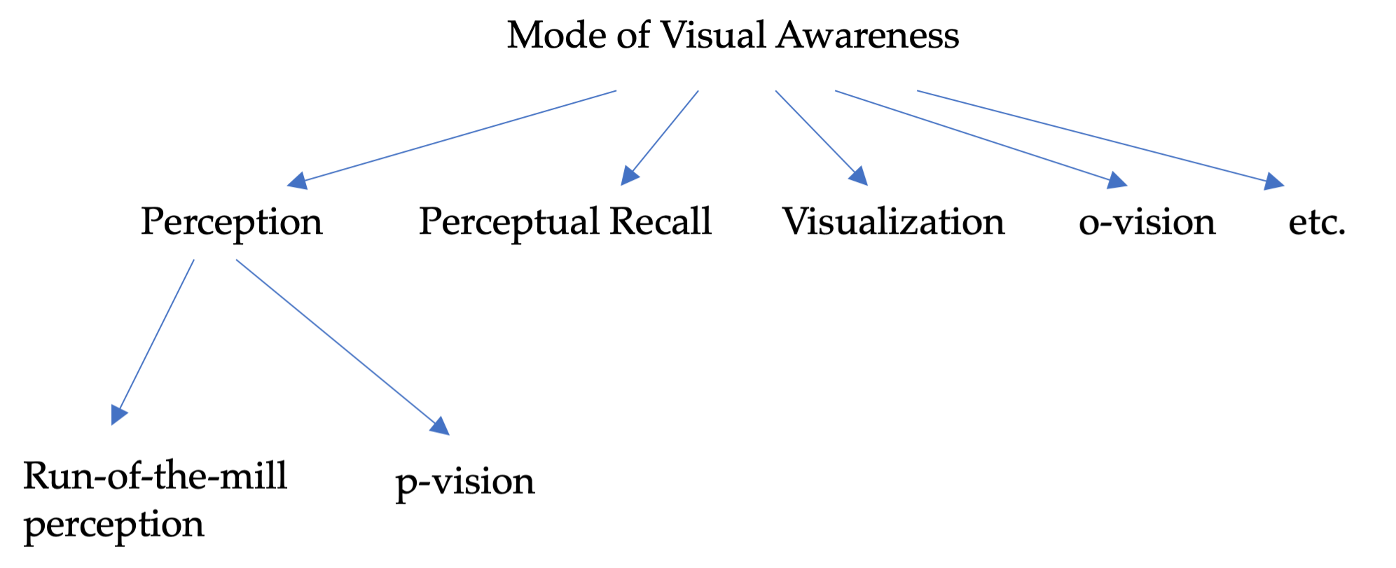 - If it were the case that o-vision belonged to a more specific genus than ‘mode of visual awareness’, such as visualization, the same would be true of this more specific genus. As I say above (§1), I myself doubt that that is the case. However, let’s suppose for the sake of argument that I am wrong, and that o-vision is a kind of visualization. In that case, the upshot of the fact that o-vision is converse to p-vision is that visualization divides into more specific species just as perception does. O-vision will be one of those species, and what we might call ‘blind-visualization’ will be another: the species of visualization that characterizes visualizing objects with our eyes closed. O-vision cannot be the same as blind-visualization because the latter is not converse to any species of perception. Being experientially aware of undergoing blind-visualization is not the same as being experientially aware of undergoing a perceptual mode of visual awareness. ⮭ ⮭