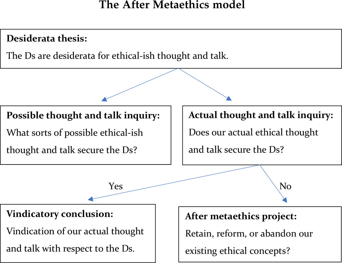 Third, there are two places that desiderata for ethical-ish thought and talk can enter the model. Most obviously, they enter into the model at the “desiderata thesis” stage. However, such desiderata are also crucial at the “after metaethics” stage. As the example of canonical error theory illustrates, some projects are framed around testing ethical-ish thought and talk for certain important desiderata. However, at the “after metaethics” stage, we may appeal to a wider set of desiderata, in adjudicating among various versions of abandonment, retention, and reform/replacement.