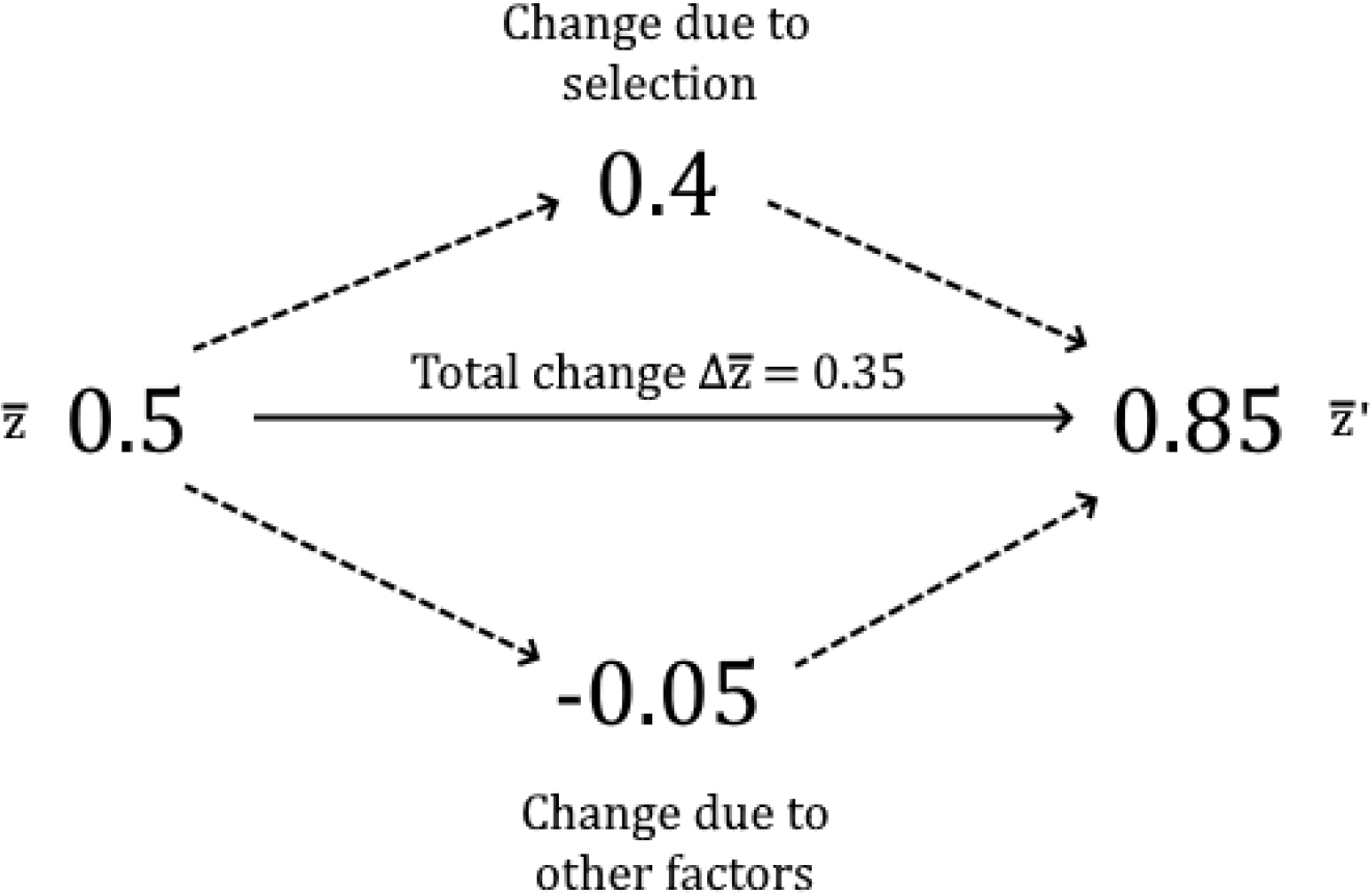Here is a worked example. Suppose the shopkeeper has three apples, of good, medium, and bad quality: . A shopper comes along and picks the good apple. Before selection, each apple has the same population share: . The average trait value is . After selection, the shopper has chosen just the good apple. Population shares are now , and the average trait value is . The total change in average trait value is . The change in average trait value due to selection is . The total change is equal to the change due to selection. They are equal because in this example apples don’t independently change in quality over time. All the change is accounted for by selection. Suppose instead apples do change their quality over time. In particular, suppose the shopper roughly handles all apples in order to determine which is best. Rough handling degrades apple quality by . Then . Now the overall change is . The change due to selection remains the same, . But the change due to other factors is . Figure 2 depicts the two sources of change contributing to the overall change.3