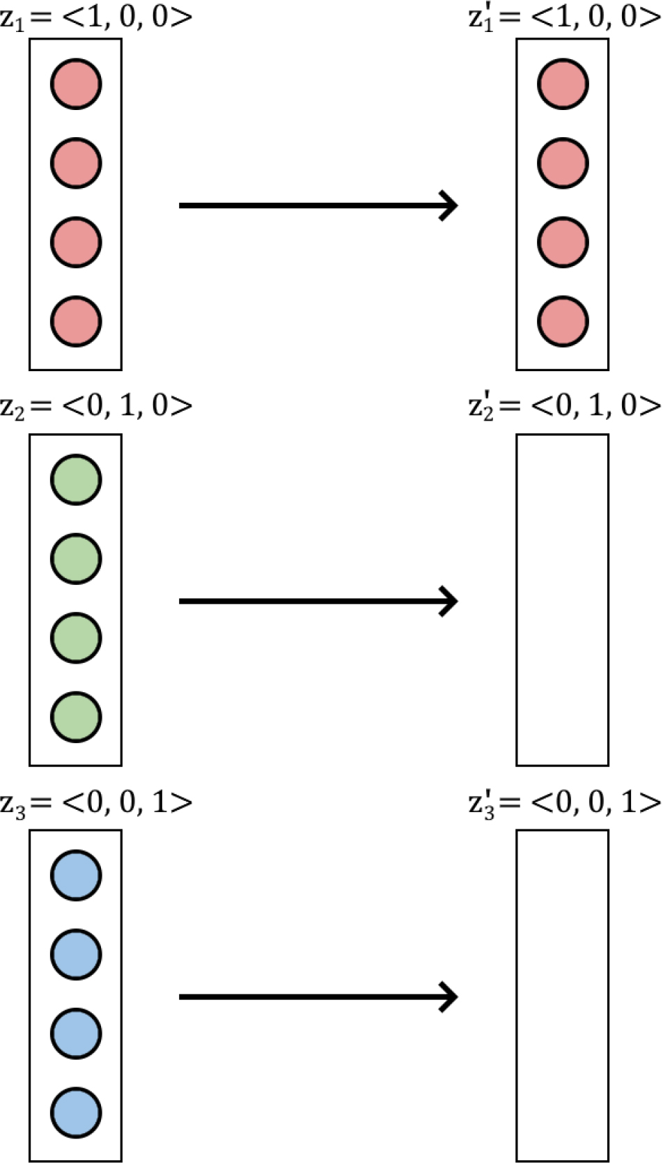 In order to write down the Price equation using vectors to represent categorical types, we need to define the remaining two terms. Fortunately, they are as intuitive as the original definitions. Let each be the vector whose values are all zero except for entries descended from the th parent, whose values are the proportions descended from that parent. For example, a red ball typically does not change colour of its own accord, so which represents the fact that every red ball stays red after selection regardless of whether it was picked (figure 3). On the other hand, if half the red balls spontaneously turn green, the vector would be (figure 4). Let be the population share of descendants of . If only red balls are chosen, then . This is true whether or not they change colour. (As before, ignores information about trait values, and ignores information about population share.)