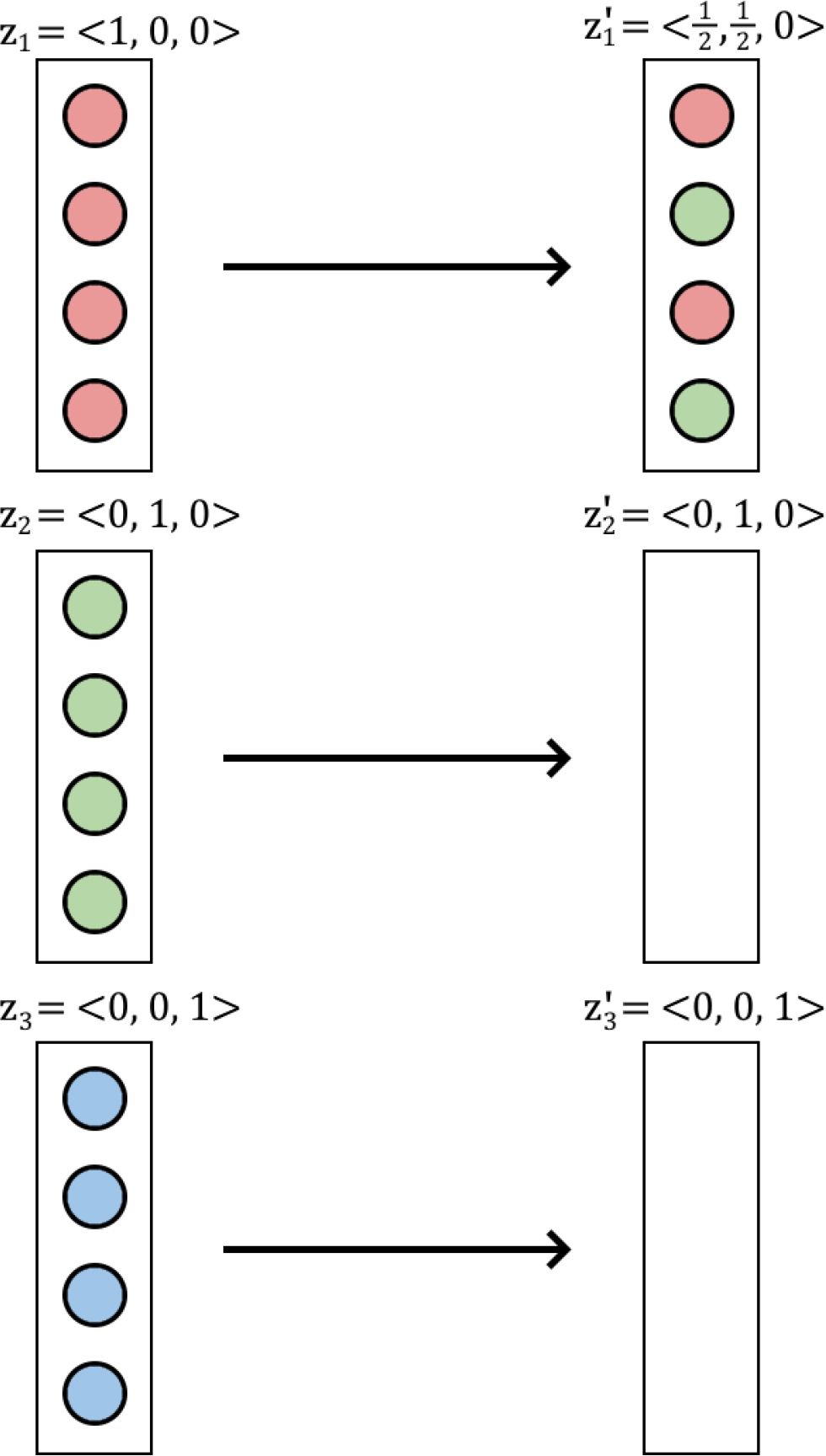 Now the distribution of balls in the shop bin can also be described by a vector. If they are initially evenly distributed, the population distribution is . This can be thought of as describing the probabilities of choosing each package when picking at random from the population. And if we let the individual be the individual population proportions as before, the overall distribution is equal to the sum :