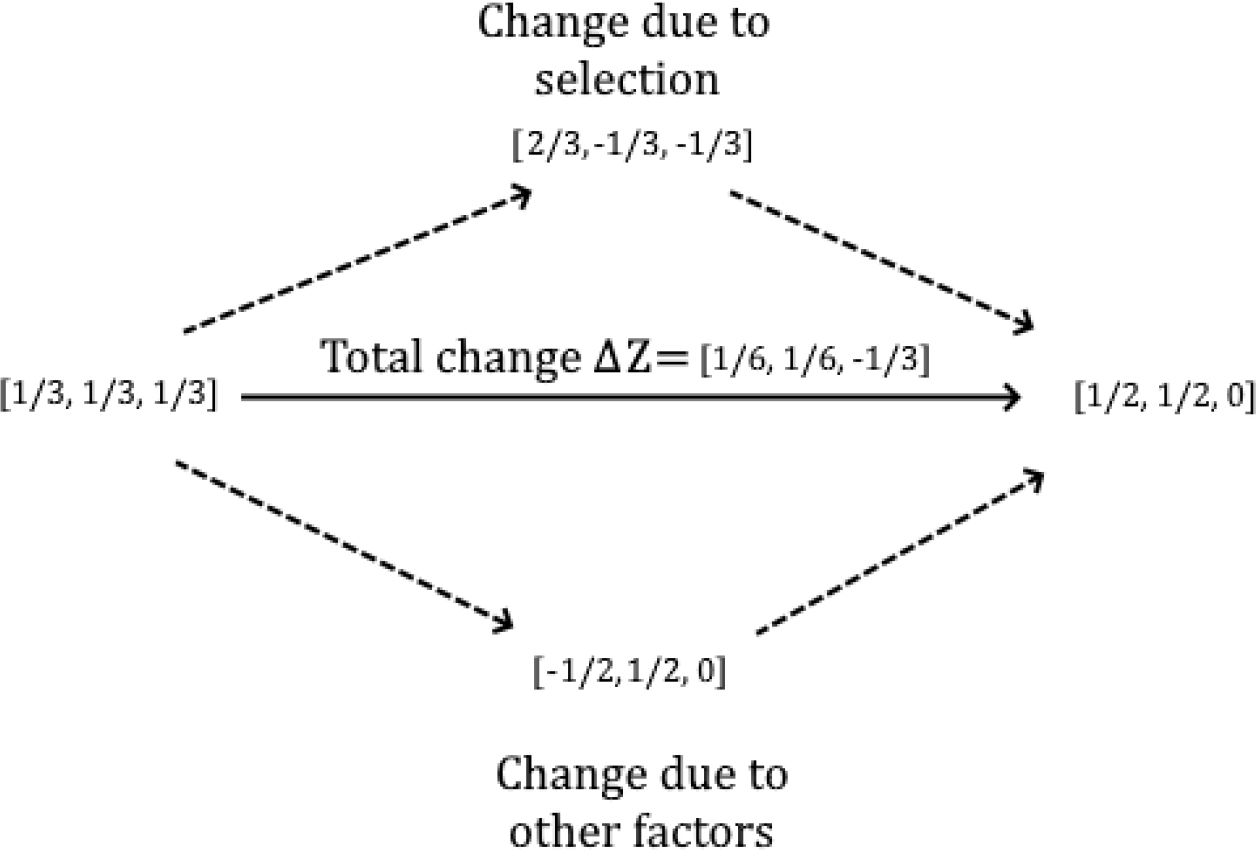 The resulting vector represents the fact that red balls have lost a population share of , and green balls have gained an equivalent share, due to sources of change other than selection (see again figure 4). The total change in this case is . Indeed, both red and green balls have increased their population share by (they initially had four out of twelve, or one third of the population, and now have two out of four, or one half) and blue balls have decreased their population share by one third (they initially had four out of twelve and now have zero). The categorical Price equation decomposition is depicted in figure 5.