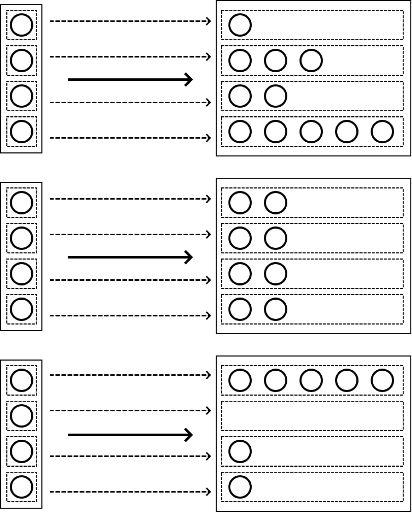 Circles are particles. Dashed boxes are particle packages. Solid boxes are collective packages. As in the original framework, each initial package corresponds to exactly one subsequent package after selection (shown by dashed arrows for particles and solid arrows for collectives). In this example, there has been selection within collectives 1 and 3 (different particles have different numbers of descendants) but not collective 2 (all particles have exactly two descendants). There has also been selection between collectives, because each initial collective has the same population share while the subsequent collectives have different population shares. The framework requires that the population share of a collective be defined in terms of the number of particles it contains; see the main text for discussion.