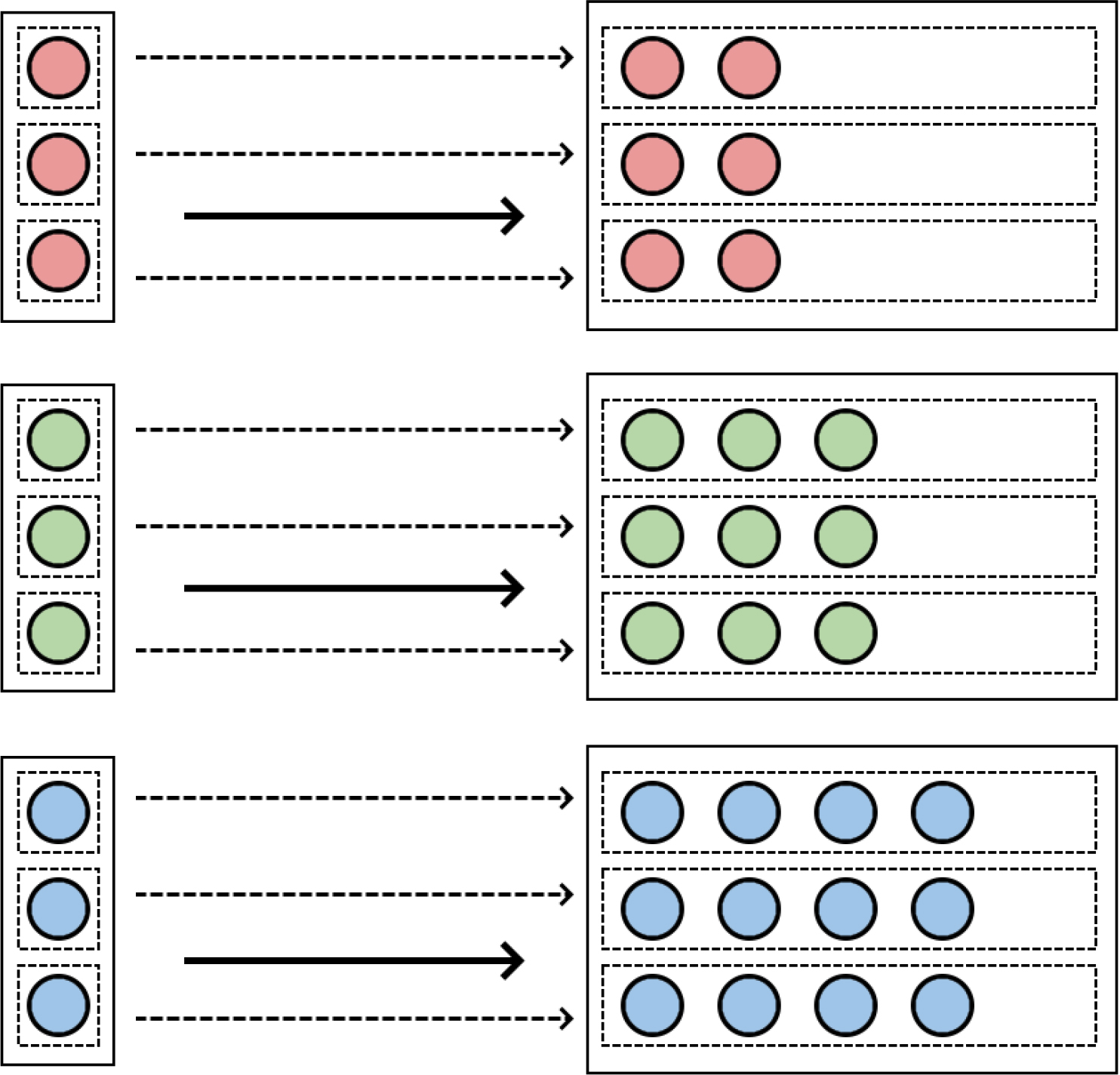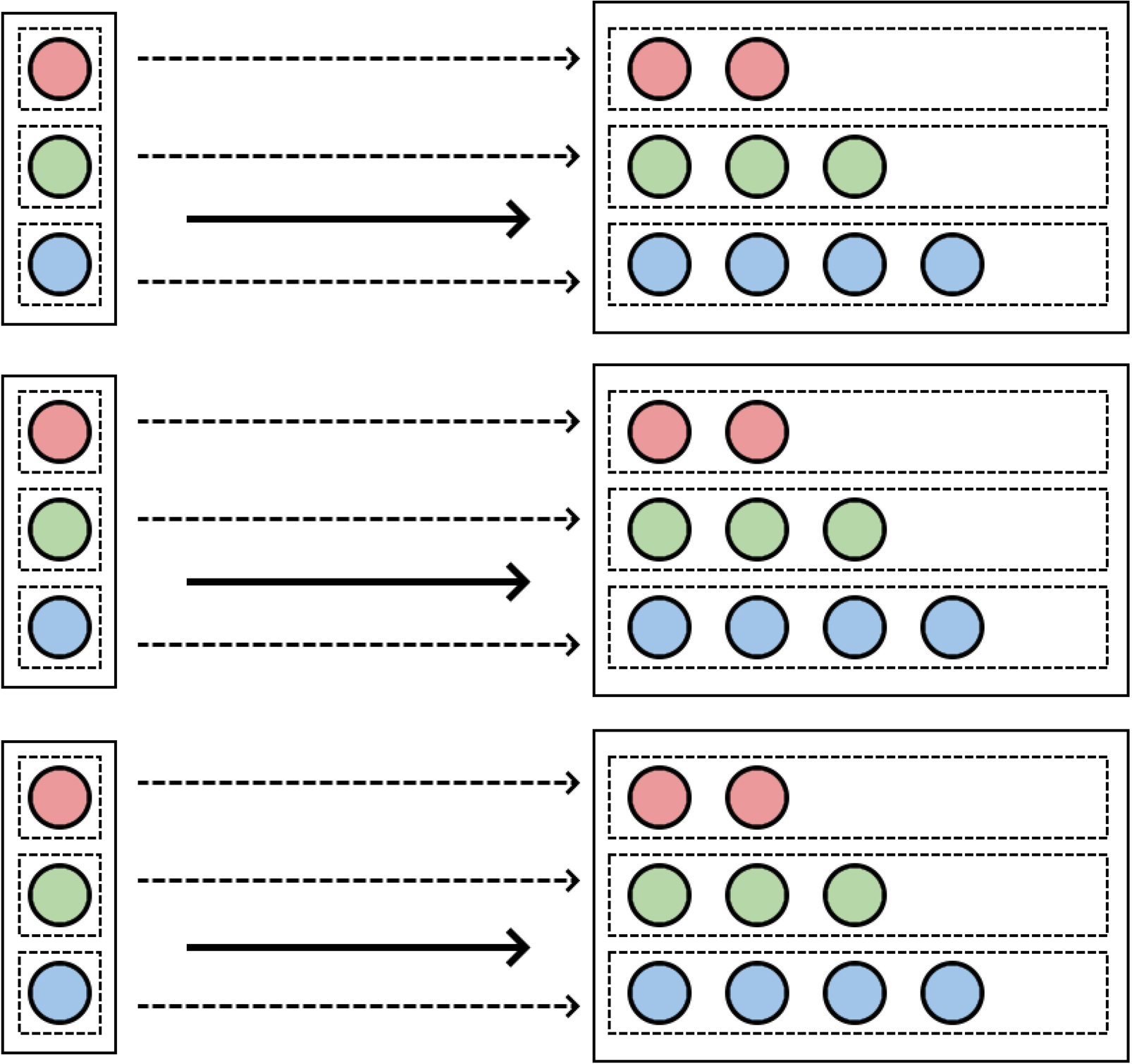 Now imagine that collectives all contain within them a microcosm of the whole population. Say for example the population has three red, three green and three blue balls, and there are three collectives with one of each type of ball (figure 8). There can be no selection between collectives because they are all identical to each other. No matter the fitnesses of the particles within, each collective’s population share after selection must be identical to its population share before selection . The first term is therefore zero, and all the selection takes place within each collective. In general there can be a mixture of selection effects between and within collectives (as in figure 6); then both terms are non-zero.