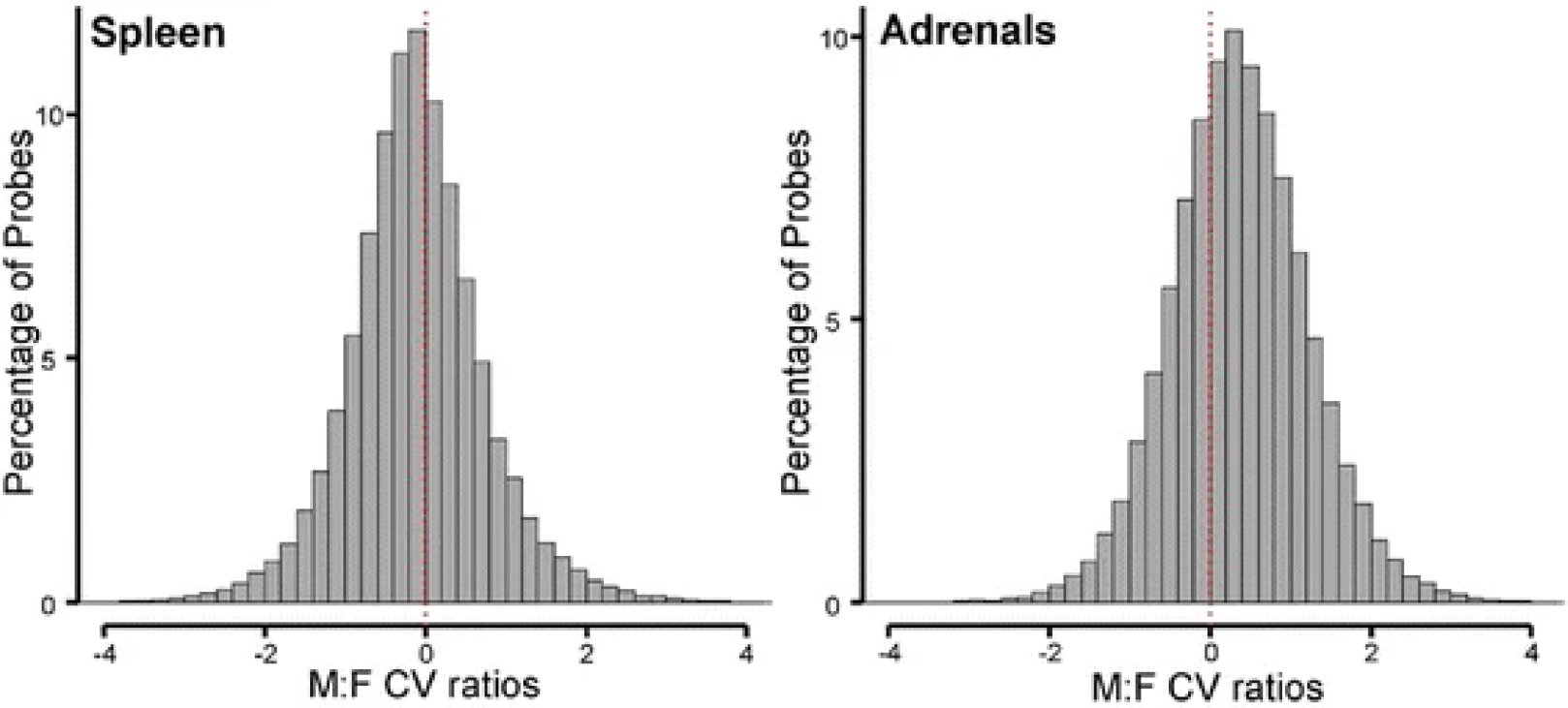 Studies positing the similarity of male and female intrinsic variability share several assumptions: first, that variability can be represented as an intrinsic propensity of males as a group and females as a group; second, that this property is yielded by comparing overall variability within sex subgroups of a species/strain; and, third, that these generalized claims about variability for a particular sex are appropriate to ground choices in research design. That is, variability is here constructed as an intrinsic propensity of each sex-group, generalizable across many traits. For example, the Dayton et al. (2016) study referenced above found that slightly more than half of traits (74 out of 142) in their sample showed a sex difference in variance. But because there was “no overall difference in coefficient of variation between male and female rats” (Dayton et al. 2016, 1139, emphasis added) when averaged across all traits, the study concluded that the results support the interpretation that there is no need to consider sex-specific variability in study design. Similarly, an analysis of sex differences in variability in gene expression in mouse and human datasets by Itoh and Arnold (2015) found an “overall sexual balance of CV ratios” (2). However, in this study, female mice had higher variation in gene expression in some systems, such as the spleen, whereas males had higher variability in others, such as the adrenals (Figure 1). Nonetheless, Itoh and Arnold conclude that such “tissue-specific sex differences … cancel each other out when considering all tissues combined” (2, emphasis added); hence, they find “no support for the hypothesis that female mice or humans are generally more variable because of their estrous or menstrual cycles or other variables” (4). But for researchers—perhaps the majority—who are not interested in an “average trait of interest” (Prendergast, Onishi, and Zucker 2014, 1) but in a particular trait of focus, claims of overall similarity or difference in variability across many traits and endpoints are of unclear utility for research design.