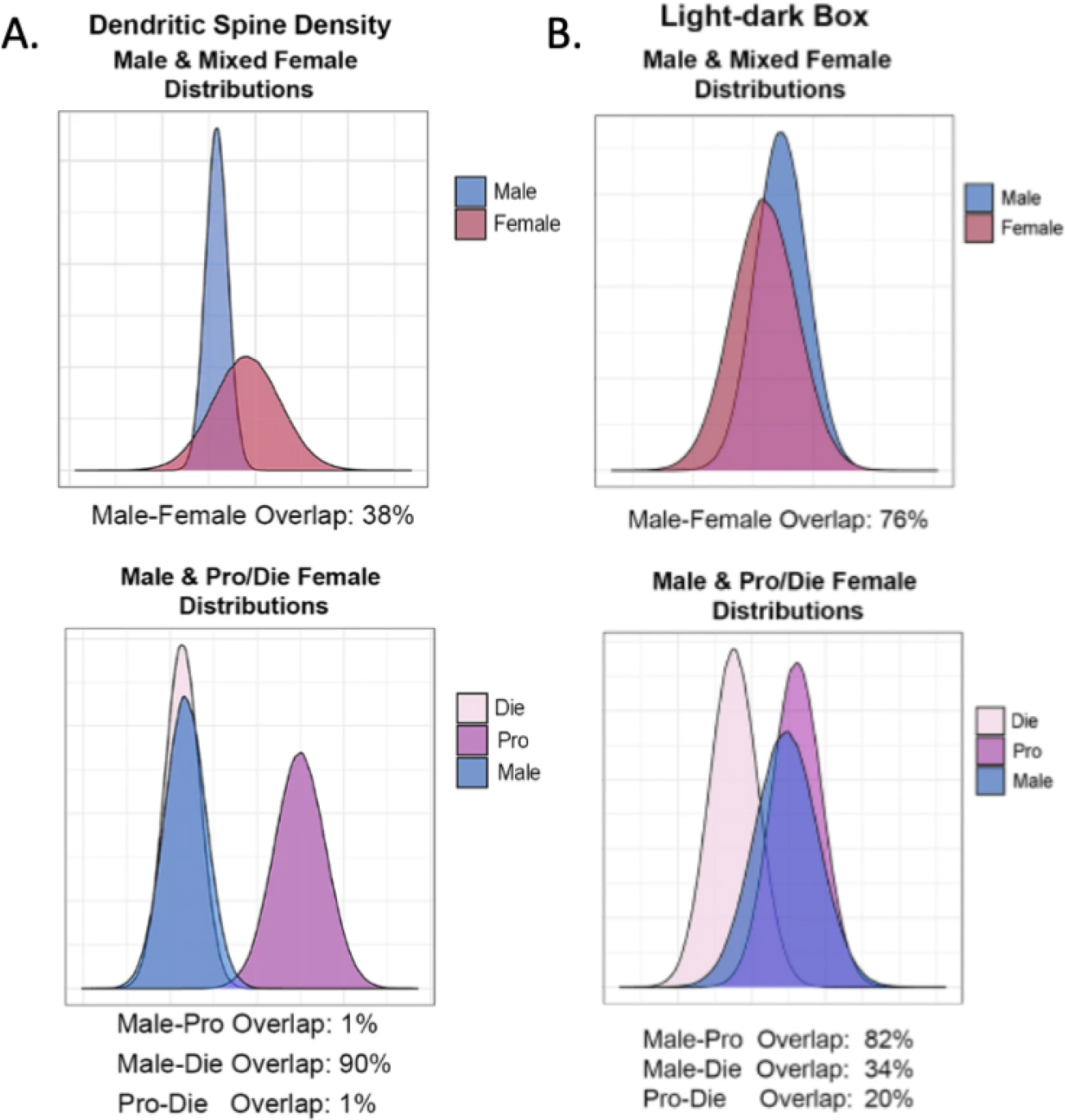 More specific to the question of estrous-related variability is a 2022 study by Rocks et al. that directly compared rodent data analyzed by estrous stage to the same data simply presented as a comparison of male and female subgroups. The reanalysis demonstrated that consideration of estrous phase leads to more precision in identification of sex-related biological mechanisms; moreover, this specificity is not predicted by measures of overall differences in variability between males and females. For example, in the case of mouse dendritic spine density, when comparing just two subgroups—males and females—a large sex difference appears, with females showing higher variability than males and only a 38% overlap in male and female distributions (Figure 2a). But when three subgroups are analyzed—males, diestrus rodents (the stage after estrus, when progesterone levels rise), and proestrus rodents (the stage immediately prior to estrus, with characteristic hormonal changes)—males and diestrus rodents are nearly identical, showing 90% overlap, while proestrus rodents show only 1% overlap with both males and diestrus rodents. Conversely, in light-dark box experiments used to study anxiety-like behavior in rodents, only a small male-female difference is observed when comparing just males and females. But when three subgroups are analyzed, large variation among females becomes apparent, with only 20% overlap between proestrus and diestrus rodents (Figure 2b). As Rocks et al. conclude, “having the information about the estrous cycle explains where the sex-based variability is coming from and allows for a mechanistic insight” (7). They argue that this “increased resolution … is because the hormonal status is a sex-specific factor that is more precise than sex” (11). Contrary to the premise of Levy et al. and others that similar levels of variability between the sexes supports the assumption that estrous cycle can be excluded from research analyzing sex-related variation, Rocks et al. (2022) find that “it is possible to not find any difference in the variability between males and females, and still find an effect of the estrous cycle” (12). In other words, “female variability does not equal (and is not predictive of) the estrous cycle effect” (1).