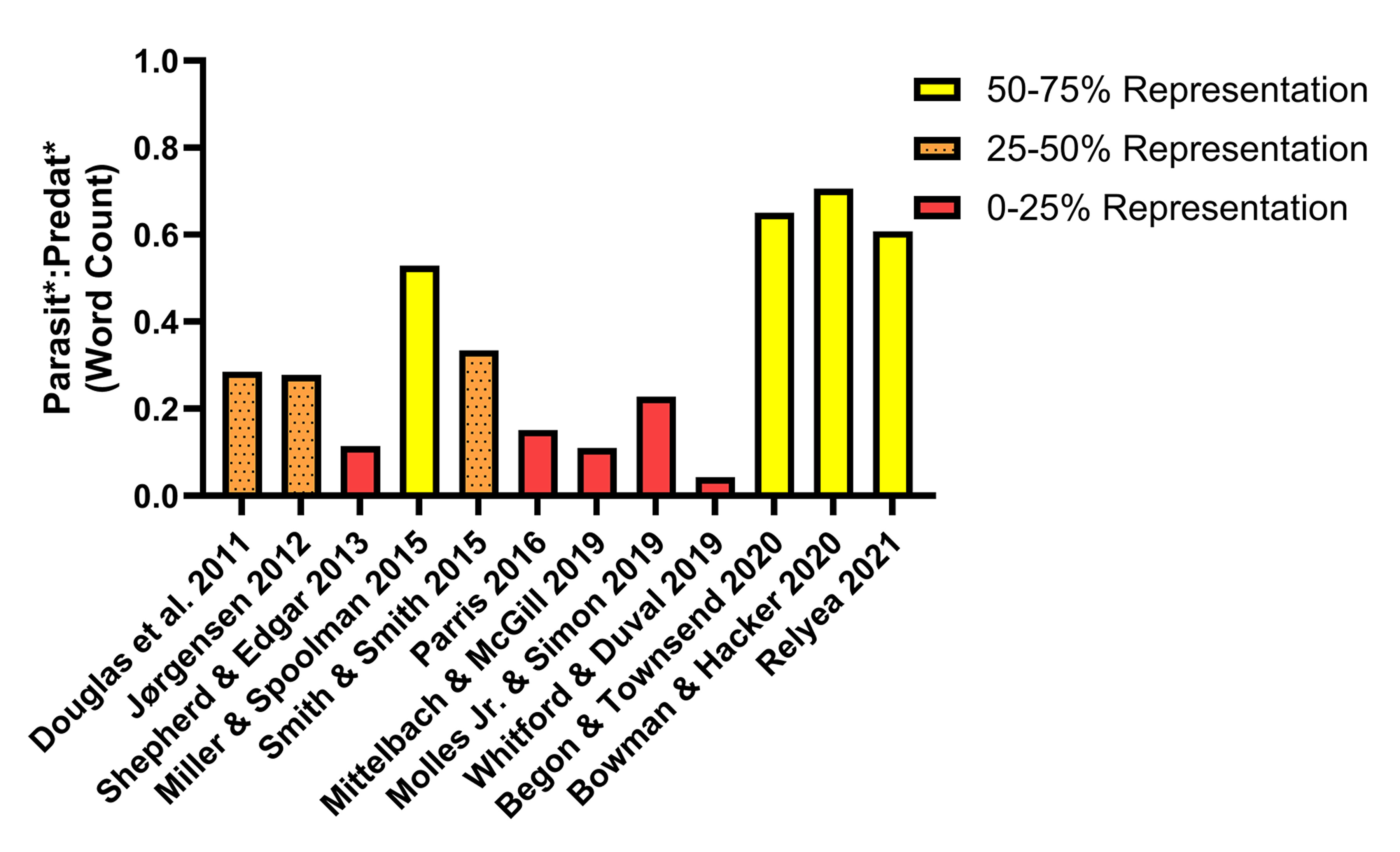 Similarly, Loreau et al. (2005) found that the journal Ecosystems, chosen because it reflects the incorporation of parasites into theories about ecological systems and not simply their taxonomic inclusion, had not published a single paper on parasites, parasitism, or parasitoids from its founding in 1998 to the time of their publication (versus 110 hits for predat- between 1998 and 2005; our search of the same journal yielded 90 results for parasit- and 475 results for predat- between 1998 and 2023). The proportion of papers featuring parasites relative to predators in ecology journals from 1991 to 2006 showed predators featured in at least twice as many publications as parasites (Raffel et al. 2008). Broad topical treatment by ecologists is consistent with this analysis of the primary literature: 21st-century ecology textbooks still largely neglect parasites in comparison to predators, with the majority featuring parasites at less than 50% the rate of predators (Figure 1).