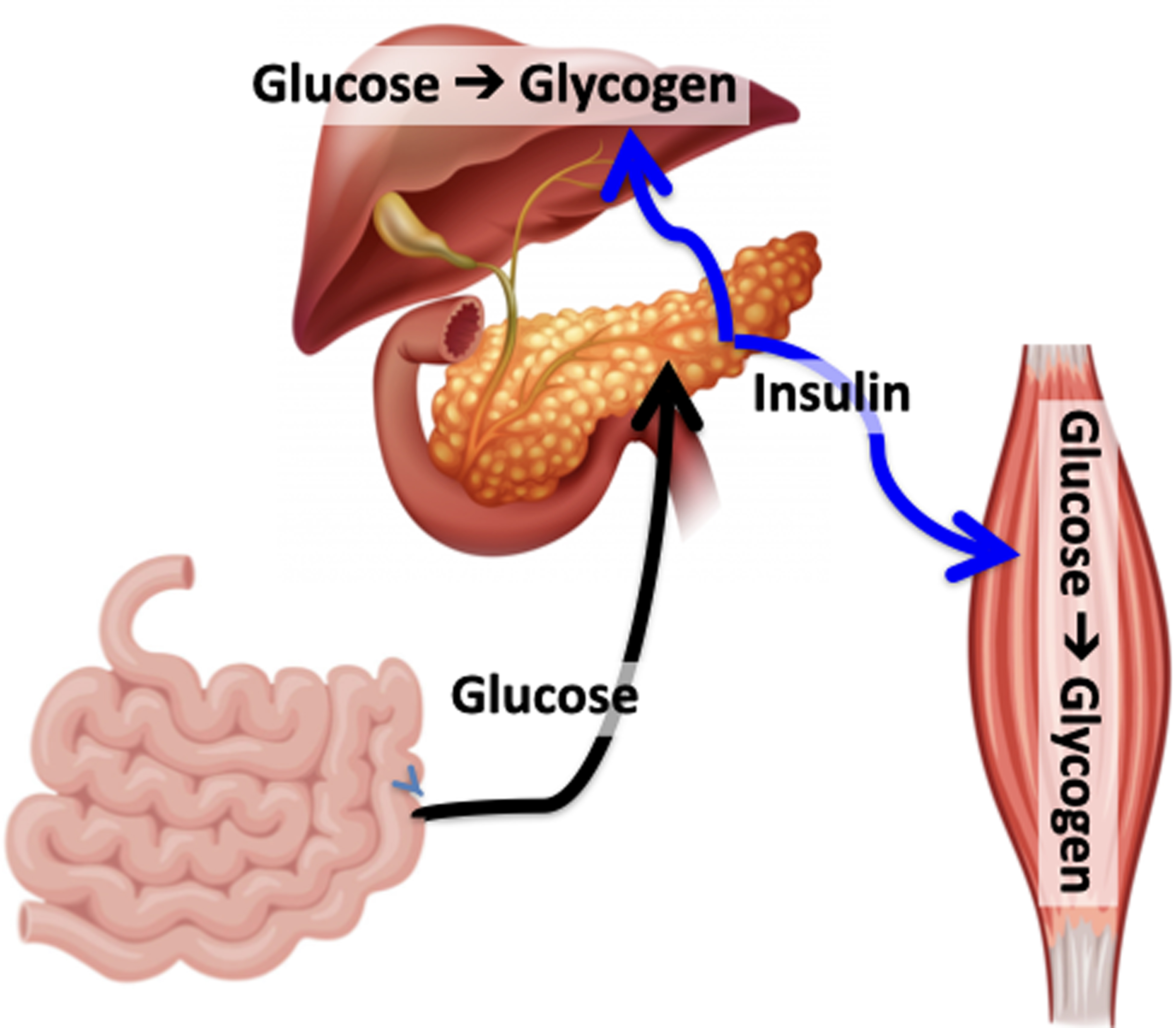 A diagram illustrating the mechanism by which insulin regulates glucose storage in the muscle and liver. The four anatomical elements are the intestines, pancreas, skeletal muscle and liver. The arrows are intended to illustrate aspects of the system that change through time and are specific to particular organs.