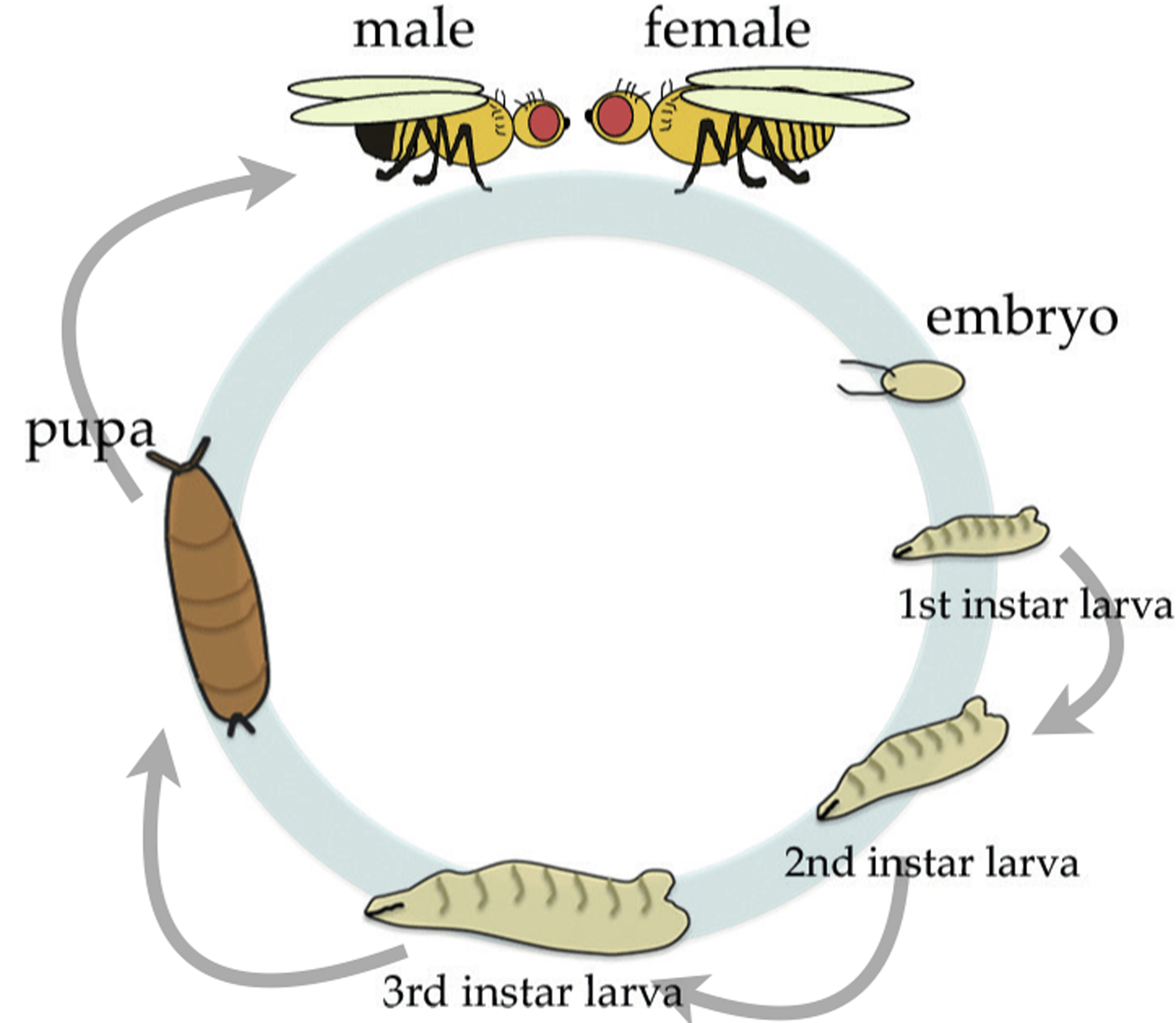Drosophila life cycle depicting the major sequential control steps required to complete growth and metamorphosis. Arrows represent sequential control events driven by ecdysone surges toward the end of each instar and pupa stage. Revised from: Allocca M., S. Zola and P. Bellosta. 2018. “The Fruit Fly, Drosophila melanogaster: The Making of a Model (Part I).” Drosophila melanogaster - Model for Recent Advances in Genetics and Therapeutics. InTech. doi:10.5772/intechopen.72832.