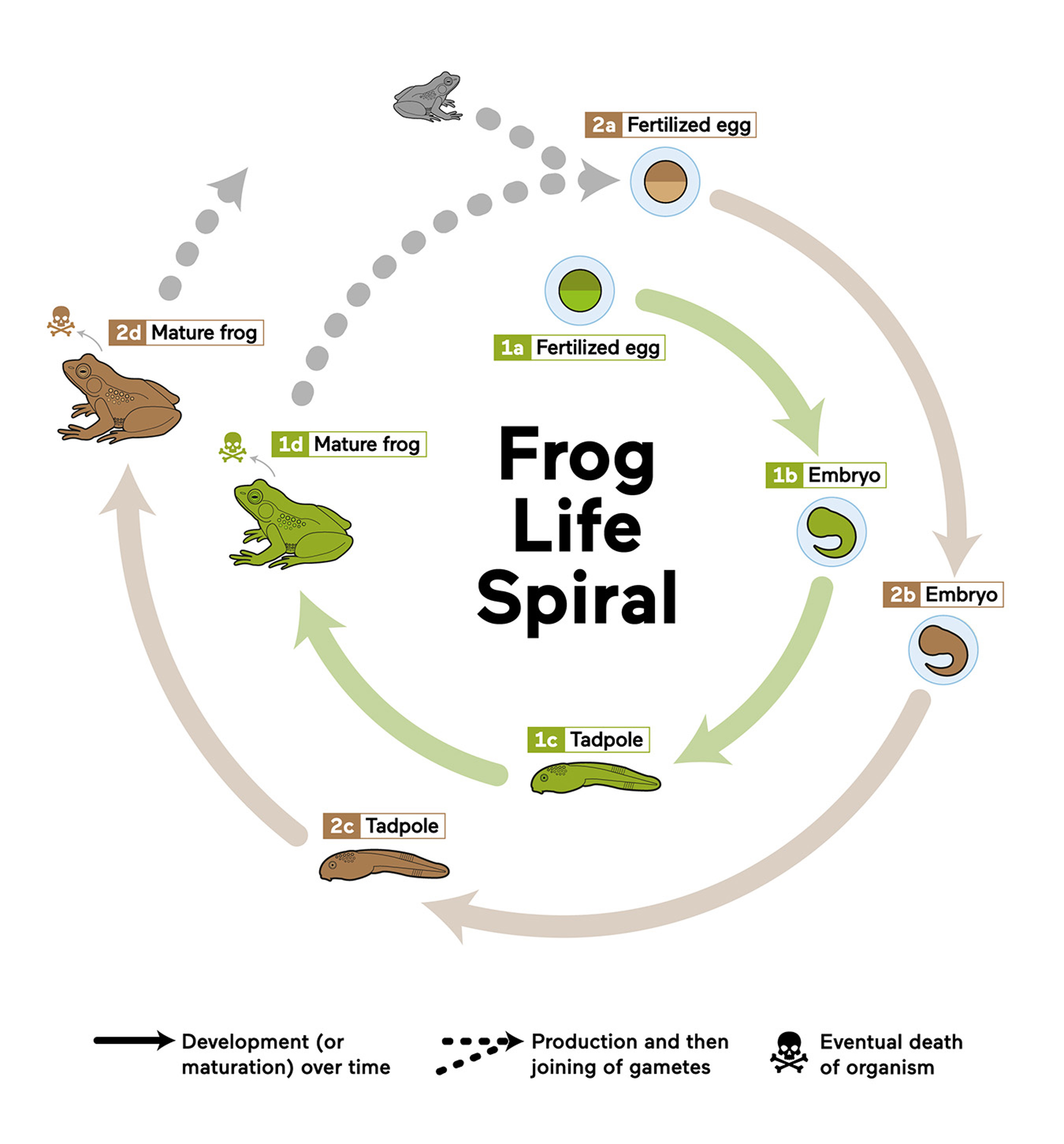 The life spiral diagram represents organisms’ mortality by depicting death with the skull and crossbones symbol. It thereby captures an important fact about the mature life stage of the organism: its end. (As noted in footnote 5, death may occur at any life stage.) The outward spiraling of the life stage progression gives a better depiction of organismal and species change over time. We used different colors to depict individual organisms which stand in parent-offspring relationships, as well as using numbers as labels for successive generations, and letters to label life stages (see fig. 2). For instance, the first-generation mature frog is labeled (1d): 1 for the generation, and d for the adult stage of life. Adult frogs give rise to the second generation by producing gametes which join to produce a new fertilized egg (2a), where 2 designates the second generation while a designates a single-celled stage of life. More letters can be added as needed whenever it is desirable to depict a greater number of intermediate organismal stages.