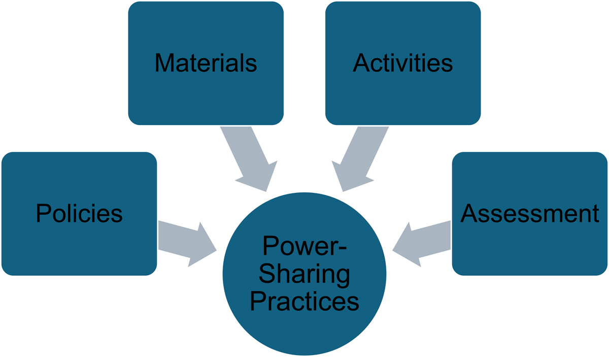 Note. Figure illustrates the components of power-sharing practices based on qualitative focus group analysis with students and faculty. A central circle labeled “Power-Sharing Practices” is surrounded by four boxes (policies, materials, activities, and assessment), with arrows pointing toward the circle.