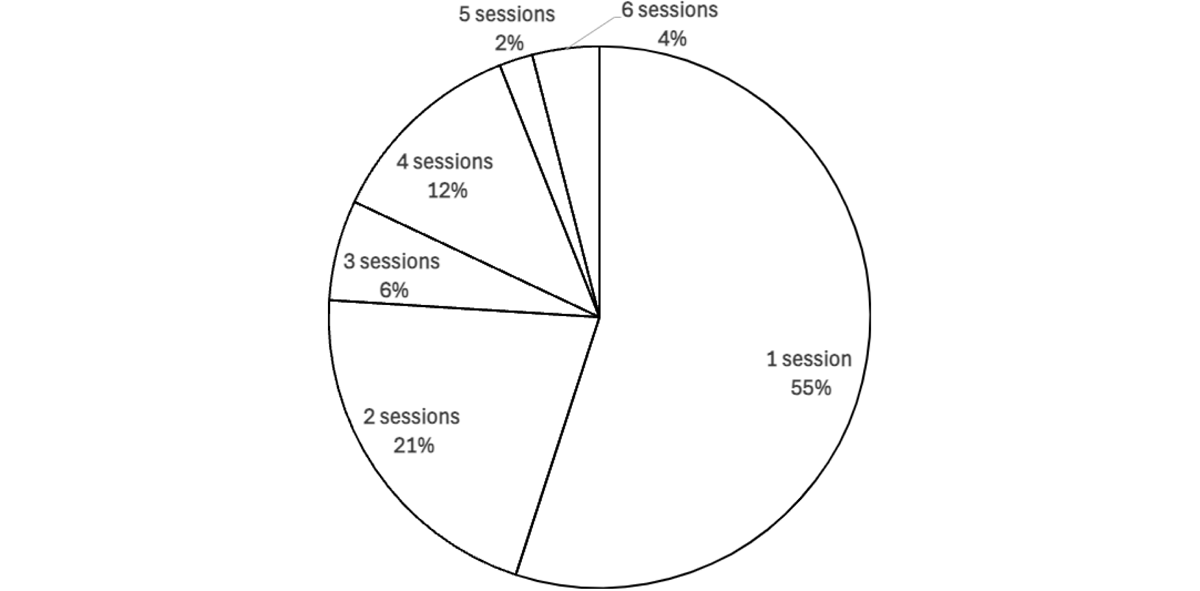 Periphery to Core Participation: A small core group of instructors who participated in several sessions contributed to our sense of the Teaching Exchange as a learning community. Other instructors who joined for select sessions contributed specific, timely expertise to the group. This was consistent with Lave and Wenger’s (1991) concept of legitimate peripheral participation, in which newcomers may find themselves at first on the periphery of discussions in a community, and then with time, they may take on a more core, central role within the community. Each session varied from 17 to 41 instructors. Most of the 83 participants participated in one or two sessions in the series (55% and 21%, respectively), while a smaller proportion attended three to five sessions (20% combined), and 4% attended all the sessions (Figure 1).