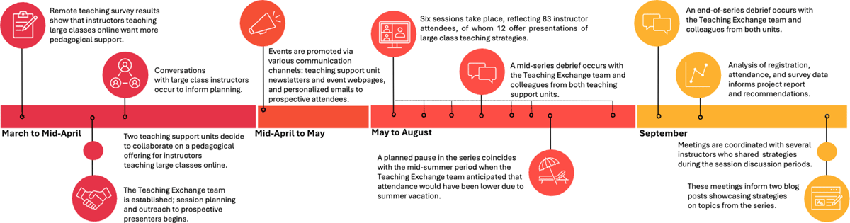Increased visibility for teaching large classes online: We sustained visibility for teaching large classes online by spreading the sessions over the summer and keeping in mind what themes would be relevant at different points in instructors’ preparation for the fall term.