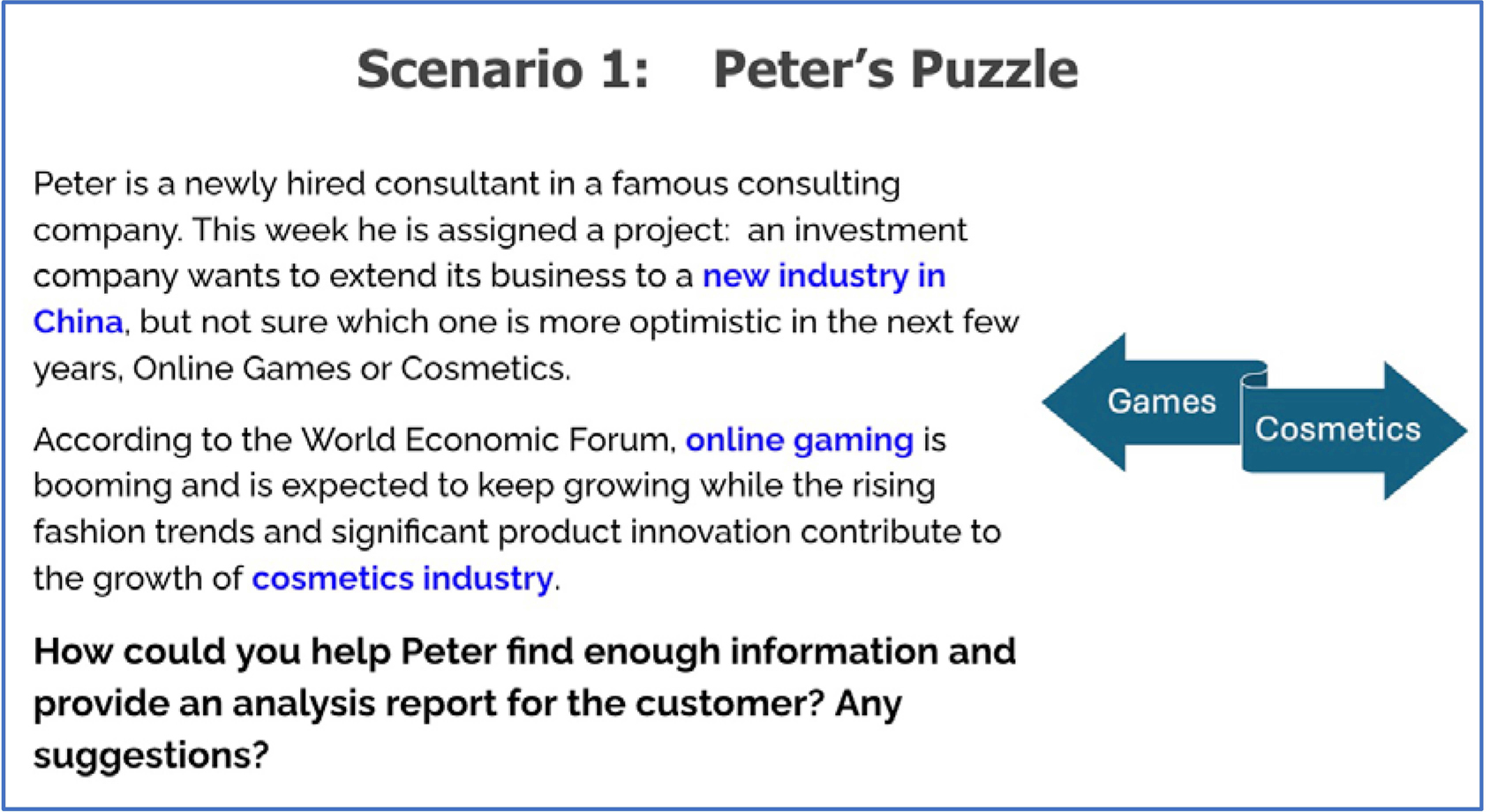From my observations and experiences of working with business faculty on these types of courses, I have identified two types of support that help students master specialized information literacy skills to finish their course assignments successfully. One type of support is scenario-based learning. This type is well-suited for lower-level students like first- and second-year business students, or students from other majors taking foundation business courses. Scenario-based learning is more accessible for students who don’t have much domain knowledge and are not clear about what information they will need. The other type of support is inquiry-based learning. This approach is more suitable for upper-level students like third and fourth-year business students, who need help to think more deeply or clearly about research topics they already have in mind.