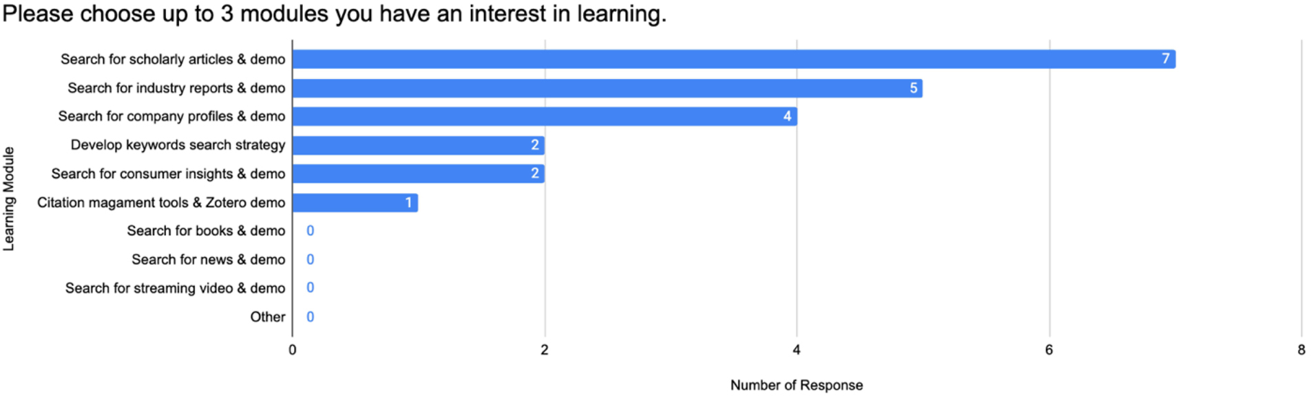 Inquiry-based learning encourages students to explore materials, ask questions, and share ideas in small groups guided by the course coordinators (Institute for Teaching and Learning Innovation, n.d.). I used this learning strategy for the course Understanding Financial Technology (an Interactive Media and Business elective) in the fall semester of 2021 and 2023, and the spring semester of 2022 and 2023. Students can choose to write research papers or design project prototypes individually. In this case, the workshop was delivered in the middle of the semester and most of the students had already discussed their research topics with the instructor, had basic knowledge of the key terms they would use in their research, and already had tried some searching before I met them. For these reasons, I focused my instruction on enhancing their information search and evaluation of their findings. To better understand the specific information literacy gaps of these students, I used a quick poll before the workshop. With the instructor’s help, I asked the students to choose up to three modules they would like to prioritize for the library workshop.