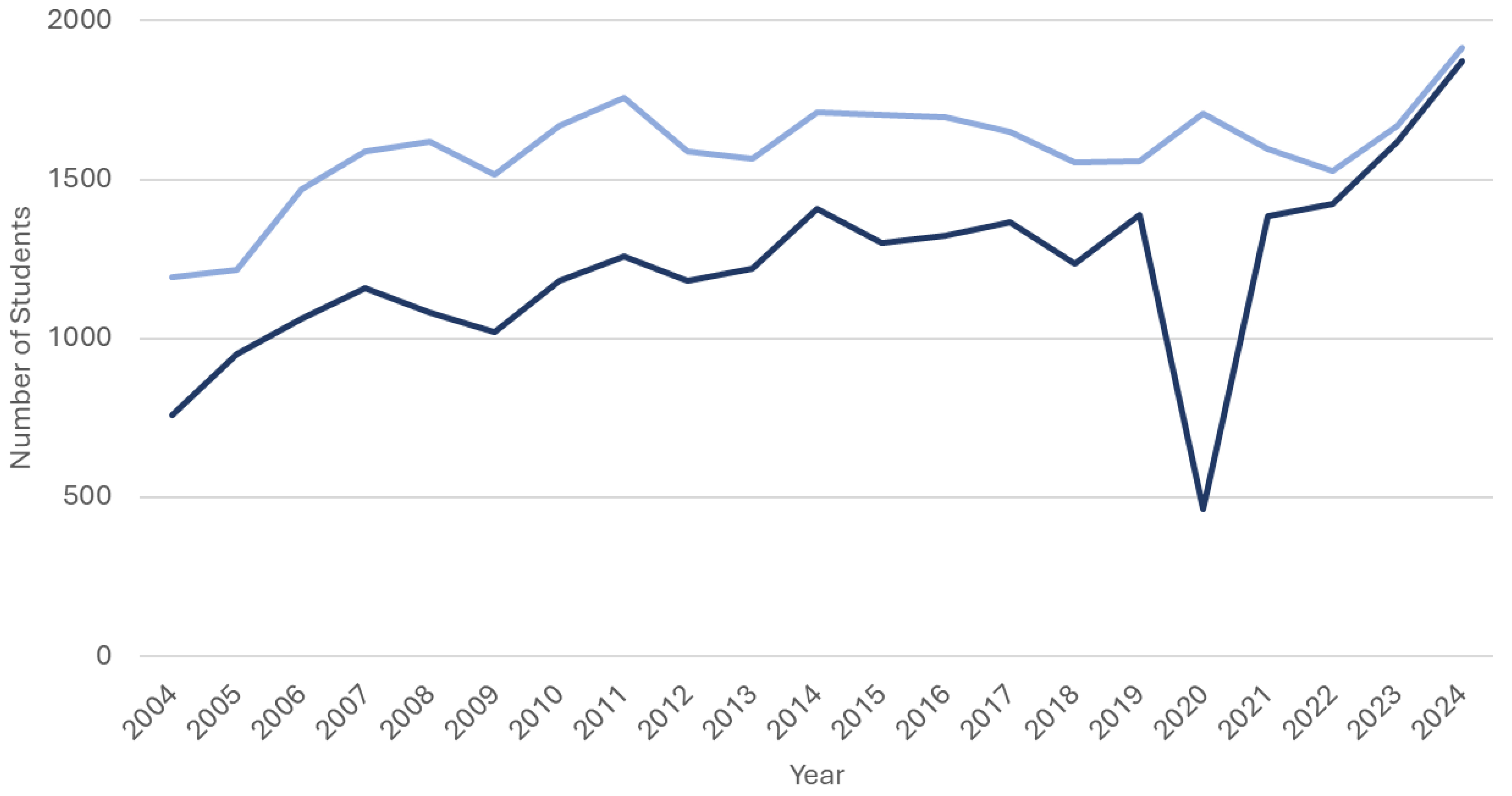 For over 20 years, one business librarian provided the sole library support for all MCOM classes; in 2023 two additional librarians were enlisted to support what had become a massive effort entailing over 100 instructional sessions per year. By 2024, increased course enrollment and uptake by instructors meant the number of library instruction sessions had increased to 117, with over 1,800 students attending. In 2004, about 64% of students taking MCOM interacted with the business librarians; by 2024, this percentage had increased to about 98%, see Figure 1.