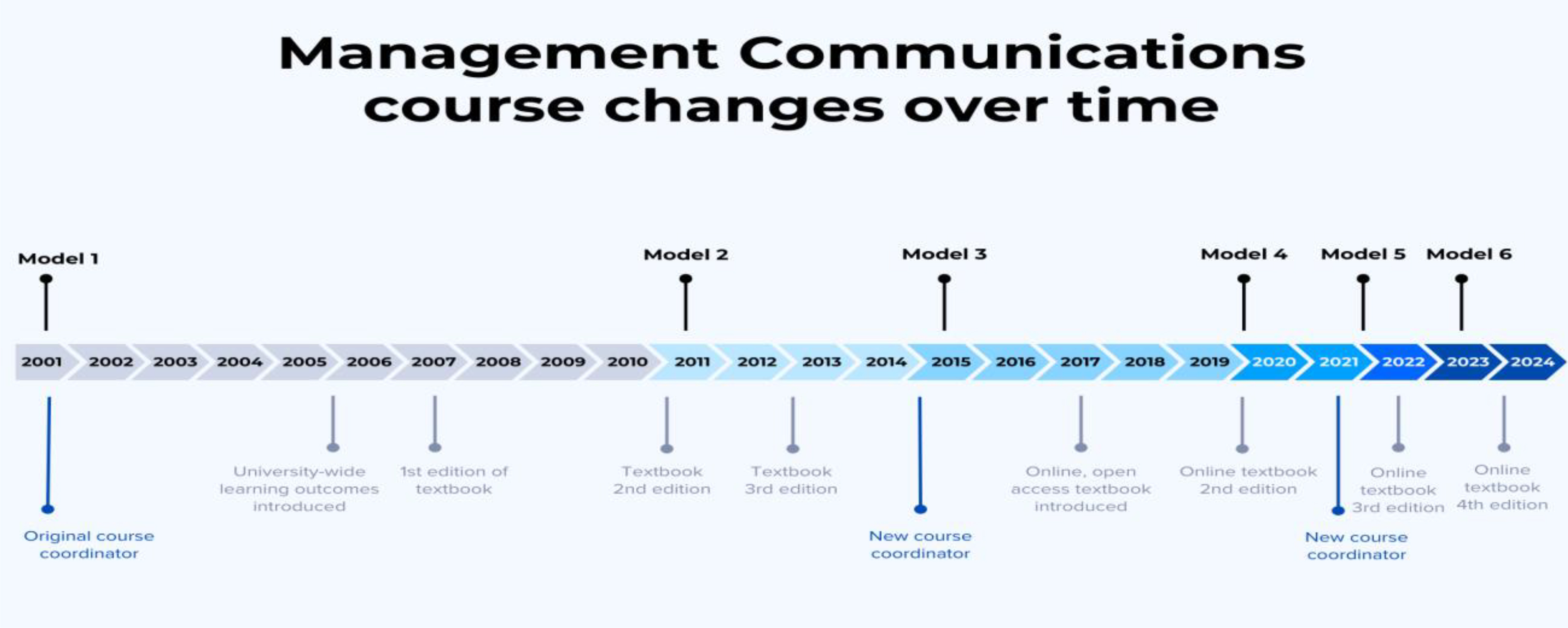 Many different methods and models have been used to embed the library into MCOM since those first one-shots in 2001. Figure 2 illustrates the course changes over time, including new course coordinators, textbooks, and learning outcomes, along with the timing of the library instructional models used to adapt to changes as the library continued to integrate with the curriculum. Model iterations are described later in this paper.