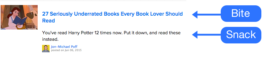 Once their statistically favorable headline is written, Buzzfeed employs the Bite-Snack-Meal method of information gathering to make sure that the user is not overwhelmed by content on their homepage (see fig. 1). Buzzfeed provides a headline (the bite), a thumbnail (which increases CTR by 27 percent) and a short, colloquial description of the article (the snack), which is what a reader needs to make a decision about whether or not to read the article (the meal).