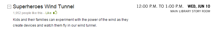 A library events calendar is the ideal litmus test for this method. There is a large amount of information that needs to be conveyed in a very small amount of space; however, many times patrons experience information overload. Ideally, patrons will be able to skim through a large quantity of events to see what is interesting or applicable to them. A good example of a library that does this well is the Salt Lake City Public Library (see fig. 2).