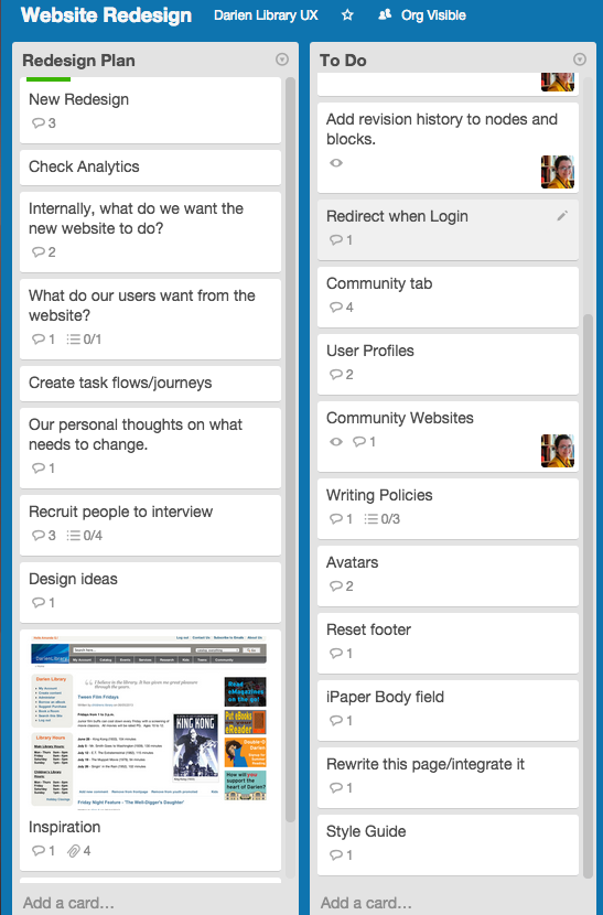 We've had a lot of Trello adoption throughout the libraries. It's great at keeping track of action items, assigning them to people and setting deadlines. Some committees have really become insistent about it.