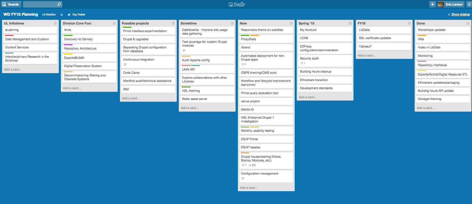 For an example, here's my department's "academic year at a glance" Trello board. This board helps us think broadly about the University Libraries' main initiatives (color coded), our larger division goals, and the department work upcoming, already in queue, or complete.