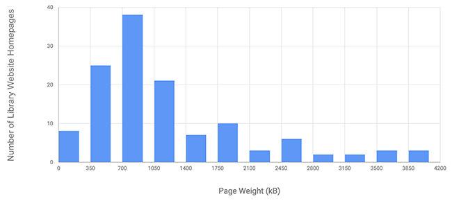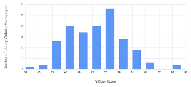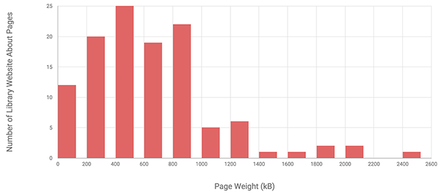 A histogram of overall scores for library homepages from PageSpeed Insights (fig. 1) and YSlow (fig. 2) shows the distribution of scores produced from each tool. The median PageSpeed Insights score was 65, and the median YSlow score was 73. These diagnostic tests revealed that library website homepages can indeed be improved. PageSpeed Insights documentation states that a score of 85 or above indicates that the page is performing well, and while YSlow has not published score guidelines, a higher score is generally considered to be better. Two key measures further demonstrate the current state of library website homepage performance: page weight (fig. 3) and HTTP requests (fig. 4). The median page weight for library homepages was 967 kB, and the median number of HTTP requests was 48. Since various pages may be more or less complex in design, there is no exact performance benchmark for page weight and HTTP requests. This analysis intends to convey the relative states of library websites included in the performance dataset.
