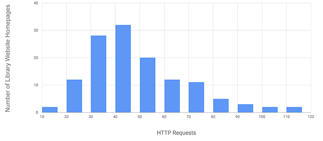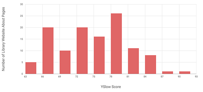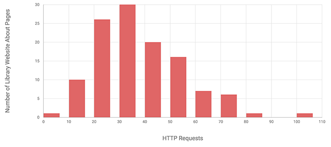 Analysis of library website about pages produced similar results. Ten library websites did not feature a discernable about page, and so the dataset for about pages includes 119 library websites. A histogram of scores for library about pages from PageSpeed Insights (fig. 5) and YSlow (fig. 6) shows the distribution of scores produced from each tool. The median PageSpeed Insights score was 72, and the median YSlow score was 75. While moderately improved over the homepages, the diagnostic tools revealed that library website about pages can also be improved. Results for page weight (fig. 7) and HTTP requests (fig. 8) for about pages reveal that they are lighter than homepages and request fewer HTTP resources. The median page weight for library about pages was 601 kB, and the median number of HTTP requests was 35.