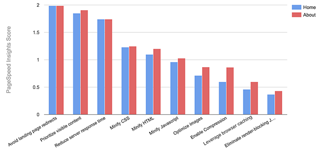To take a deeper dive into the results, I then looked at the individual performance rules of library website homepages and about pages as scored by both PageSpeed Insights (fig. 9) and YSlow (fig. 10). For the purposes of data analysis, I converted each tool’s rule measurement scores to numerical scores. PageSpeed Insights scores were converted to a 2-point scale, with 2 for “passed rules,” 1 for “consider fixing,” and 0 for “should fix.” YSlow scores were converted to a 5-point scale, with 5 for an A, 4 for a B, 3 for a C, 2 for a D, 1 for an E, and 0 for an F. I aggregated the results for all institutions and generated average mean ratings for each performance rule analyzed by PageSpeed Insights and YSlow. While not directly comparable, these two scales effectively show performance relative to their respective rules and scoring systems.