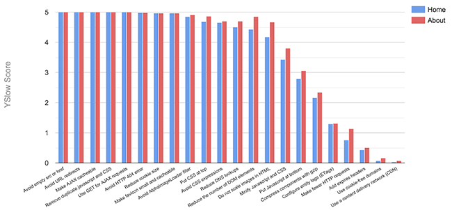 In the initial pre-enhancement evaluation, the homepage scored a 76 from PageSpeed Insights (76th percentile in the performance dataset) and a 73 from YSlow (46th percentile). The homepage weighed 720 kB (29th percentile) with 30 HTTP requests (11th percentile). After completing the Performance Enhancement Plan, the homepage scored a 96 from PageSpeed Insights (99th percentile equivalent) and a 96 from YSlow (99th percentile equivalent), with a page weight of 238 kB (1st percentile equivalent and a decrease of 67 percent) and 14 HTTP requests (1st percentile equivalent and a decrease of 53 percent). In short, the Performance Enhancement Plan worked.