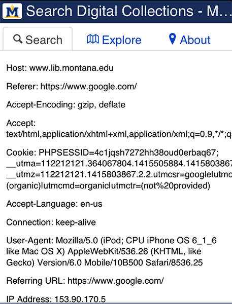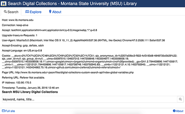A missing piece in our methods so far has been a lack of trying to understand context or intention in time and space. There are lots of means to try to pick up these cues. One of the first places to start is with the HTTP headers found inside of a web browser request when a link is clicked and a page is returned. Figure 4 shows screenshot of a search interface with HTTP header data and various global system information showing for demonstration purposes.7