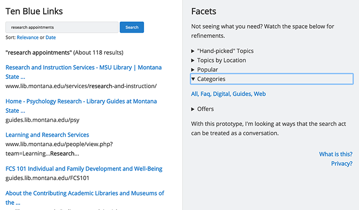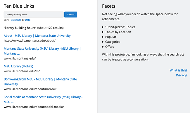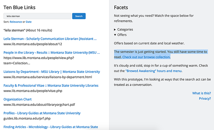 This facet brings an offer to search the library browsing collection based on recognition of where we are in the semester calendar, but there are all kinds of possibilities here. Depending on time in the semester, we could look to surface writing help or citation and research services. Depending on time of day, we could push hours or an event that is happening later tonight. On a lighter note, we can even offer a cup of coffee at the library cafe based on the current weather. The prototype is an exercise in building a dialogue with a user and trying to realize anticipatory design possibilities.