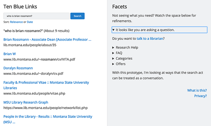 And there are still other ways to build anticipation into the system design model. As we noted in the previous section, watching for intentional cues, like natural language questions, in the query itself can lead to a different set of facets focused on facilitation moments such as connecting with a librarian or being able to look at the organizational FAQ knowledgebase to see if a similar question has been answered. Figure 10 demonstrates how a natural language question query makes a question facet appear along with an invitation to talk to a librarian.