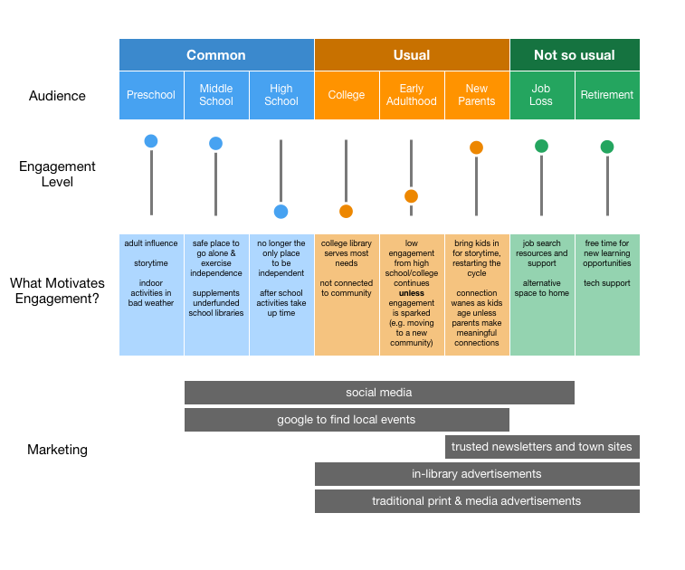 We hope that by sharing the ways engagement can shift over a person’s life, we can help public libraries overcome that obstacle by understanding how to target their efforts based on specific audiences’ needs, as well as how to deepen existing engagements. We want to encourage readers who want to know more, or who are doing their own kind of experimentation, to be in touch!