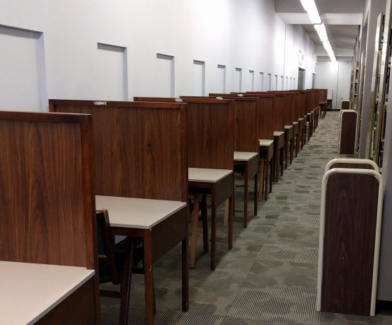 I had planned to do seat sweeps similar to those done by Given and Leckie (2003) to find out where people were and what they were doing in the library. However, because of our library’s configuration I wasn’t able to stand in a few spots and gather information about a large number of spaces; many of our carrels are arranged in long lines with a narrow aisle separating them from the stacks, so sightlines are poor (see fig. 3). I tried a test sweep of a section of the building with these kinds of carrels to see how much information I could capture. It became readily apparent that students were unnerved by someone walking slowly down the aisle beside them, making notes on a clipboard. It was better when I picked up the pace and simply counted them, but when I took even a small amount of time to glance at what they were doing, they would notice me and look up. I didn’t want to break student concentration or make them feel uncomfortable. Because of the limited sightlines in narrow spaces, seat sweeps became head counts—checkmarks in the places people were sitting.