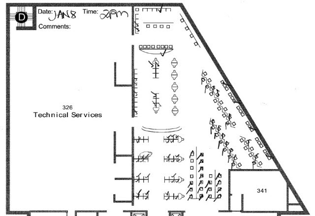 I updated our floor plans with the furniture layout so it was easy to mark where people were. For each sweep, stacks staff wrote in the date and time, made checkmarks where people sat, and circled the marks where people were actively working together. From that relatively small bit of data, I could then analyze the relative popularity of renovated spaces versus older spaces, silent spaces versus those that allowed quiet conversation, various kinds of furniture in the library, and window spaces versus interior spaces. I could see where and when people were doing group work. I could look at patterns over the course of the term or by time of day. By using detailed floor maps, if the data showed that particular seats were never used, I could follow up to find out why; were there problems with power outlets? Drafts? Excessive noise? Using detailed floor maps also made it easy for the staff gathering the data to keep track of which sections had been completed. The downside was that I had to keep the maps up to date when furniture was shifted.